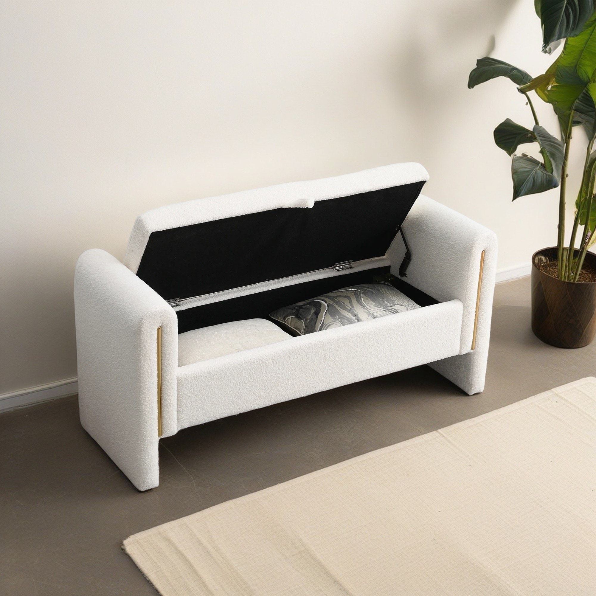 Elegant Upholstered Storage Bench with Cylindrical Arms and Iron Legs