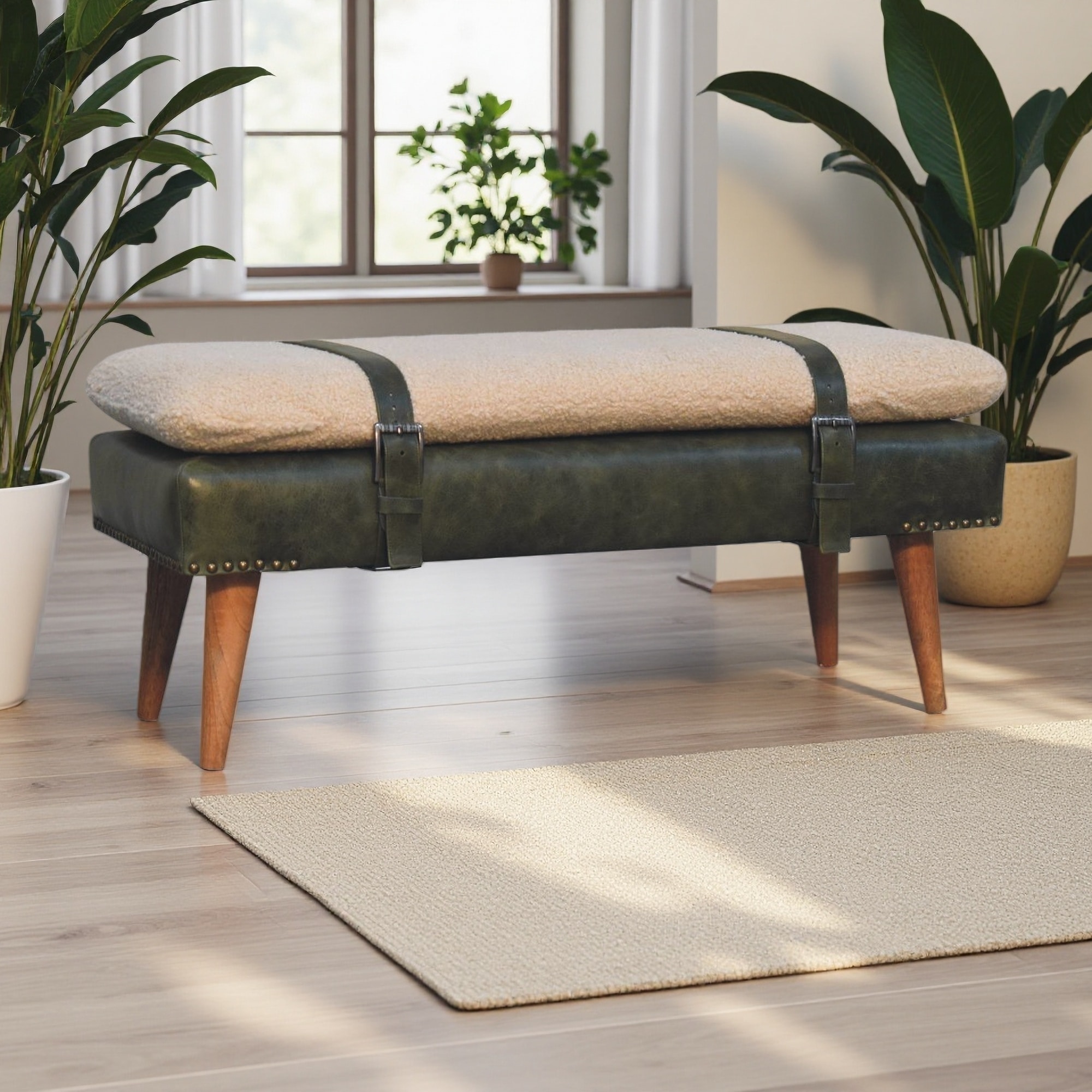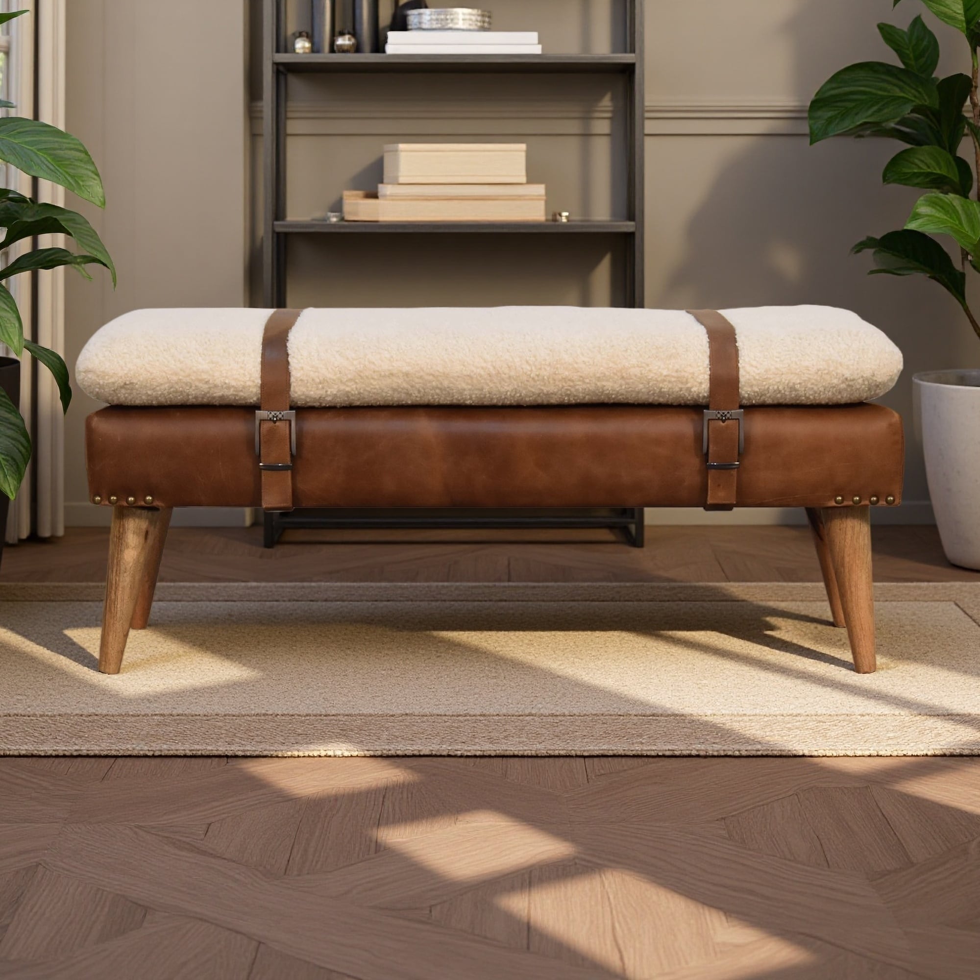 35.4"L Solid Wood Boucle Tan Leather Bench with Handwoven Cotton and Nordic Oak-ish Legs