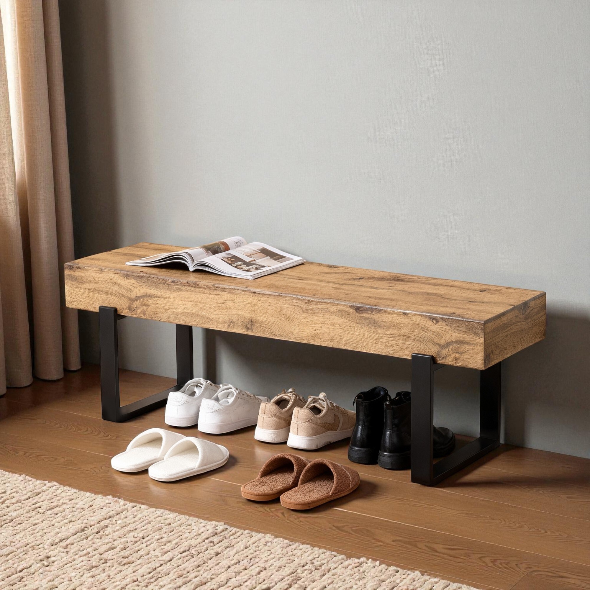 59" Farmhouse Living Bench with MDF Seat and Metal Legs, Entryway Bed Bench or Industrial Shoe Bench for Kitchen and Hallway