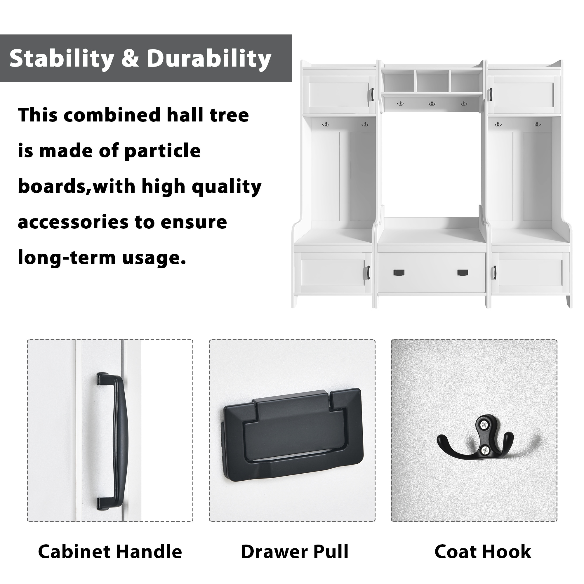 White 4-in-1 Hall Tree - Entryway Organizer with 7 Hooks, Bench, and Cabinets