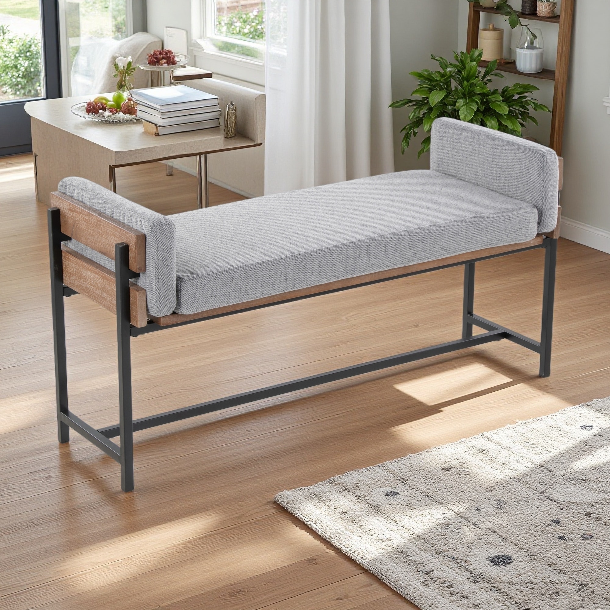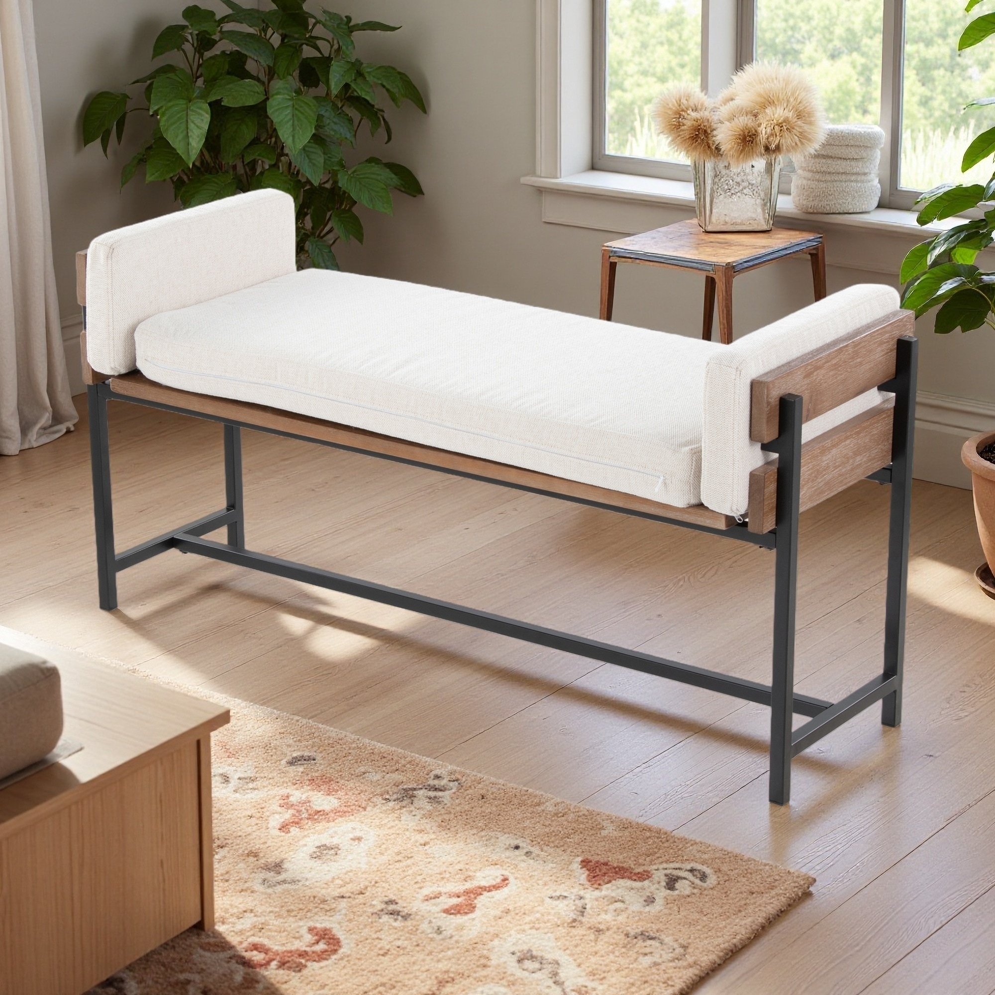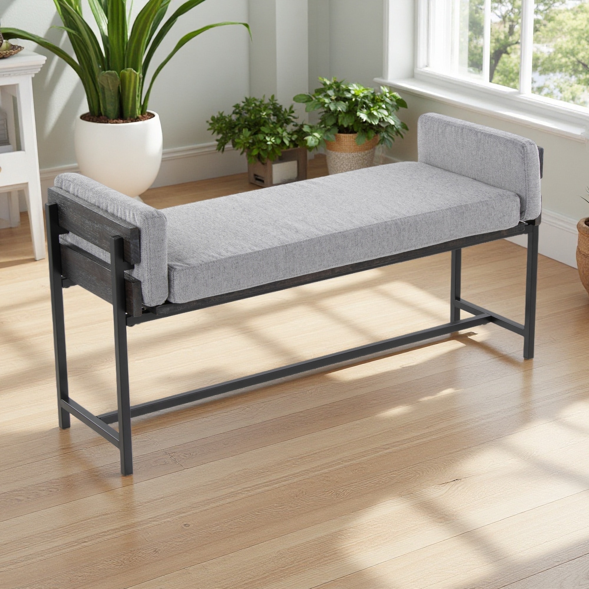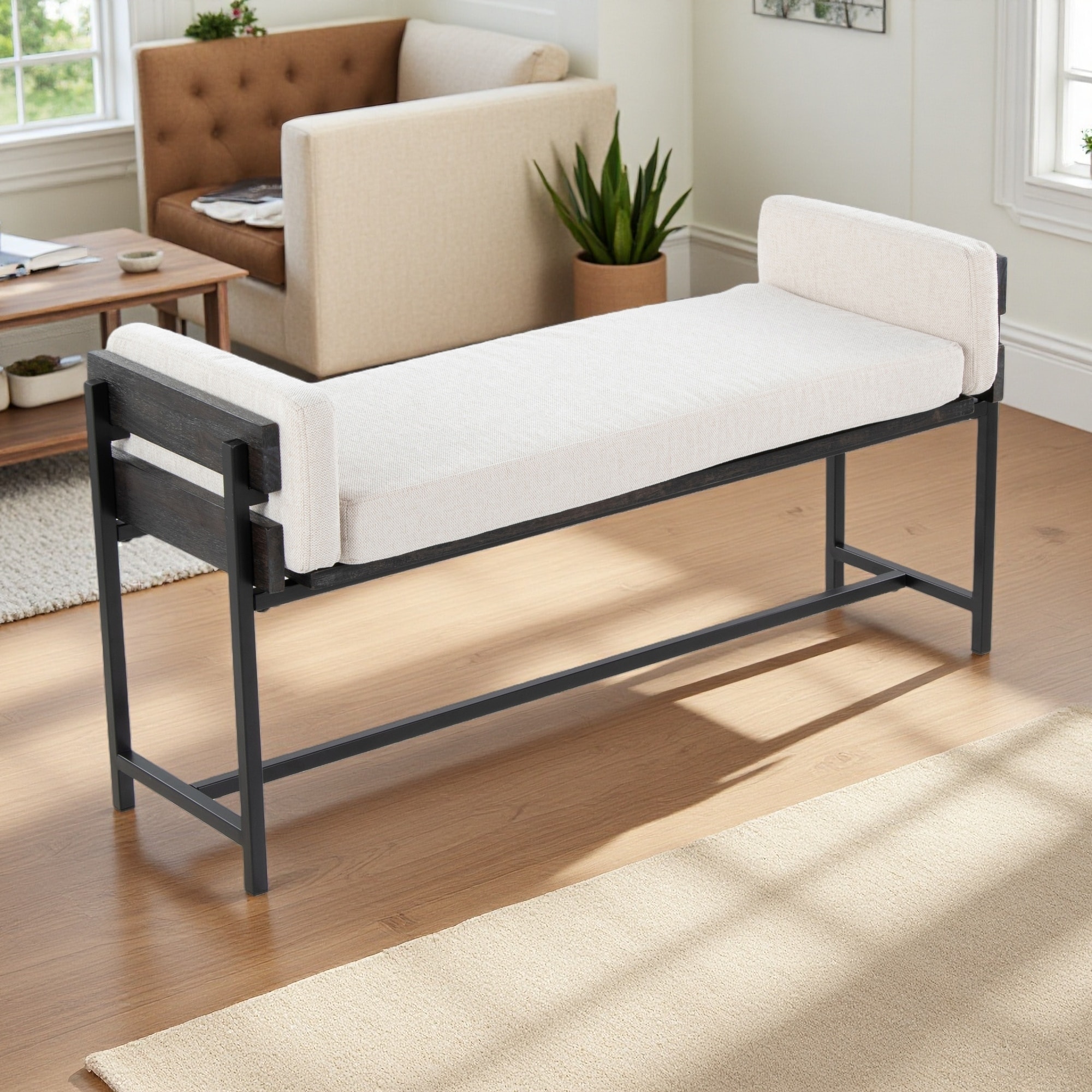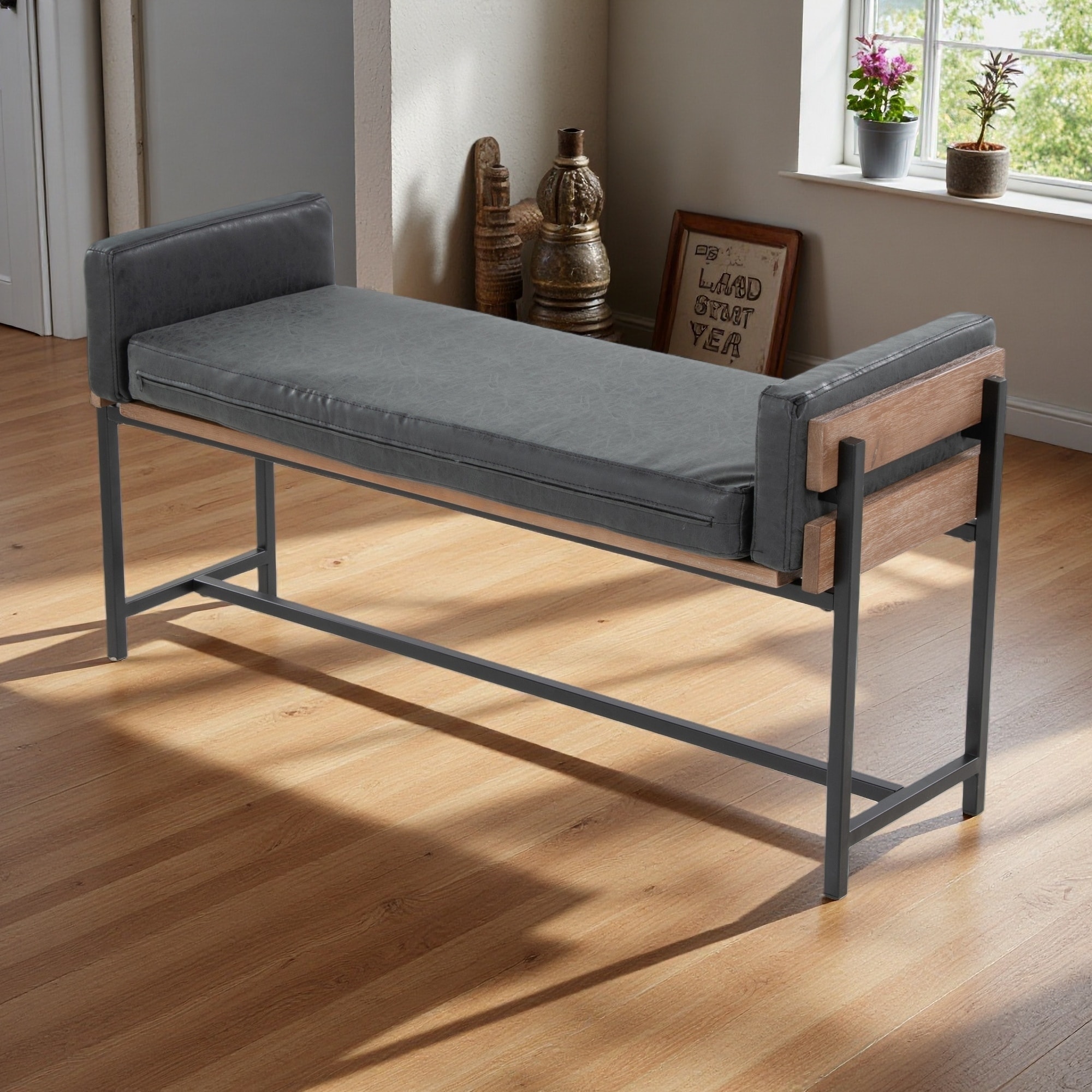 45.25"L Farmhouse Bench with Metal, Wood and Faux Leather Upholstery with Padded Seat