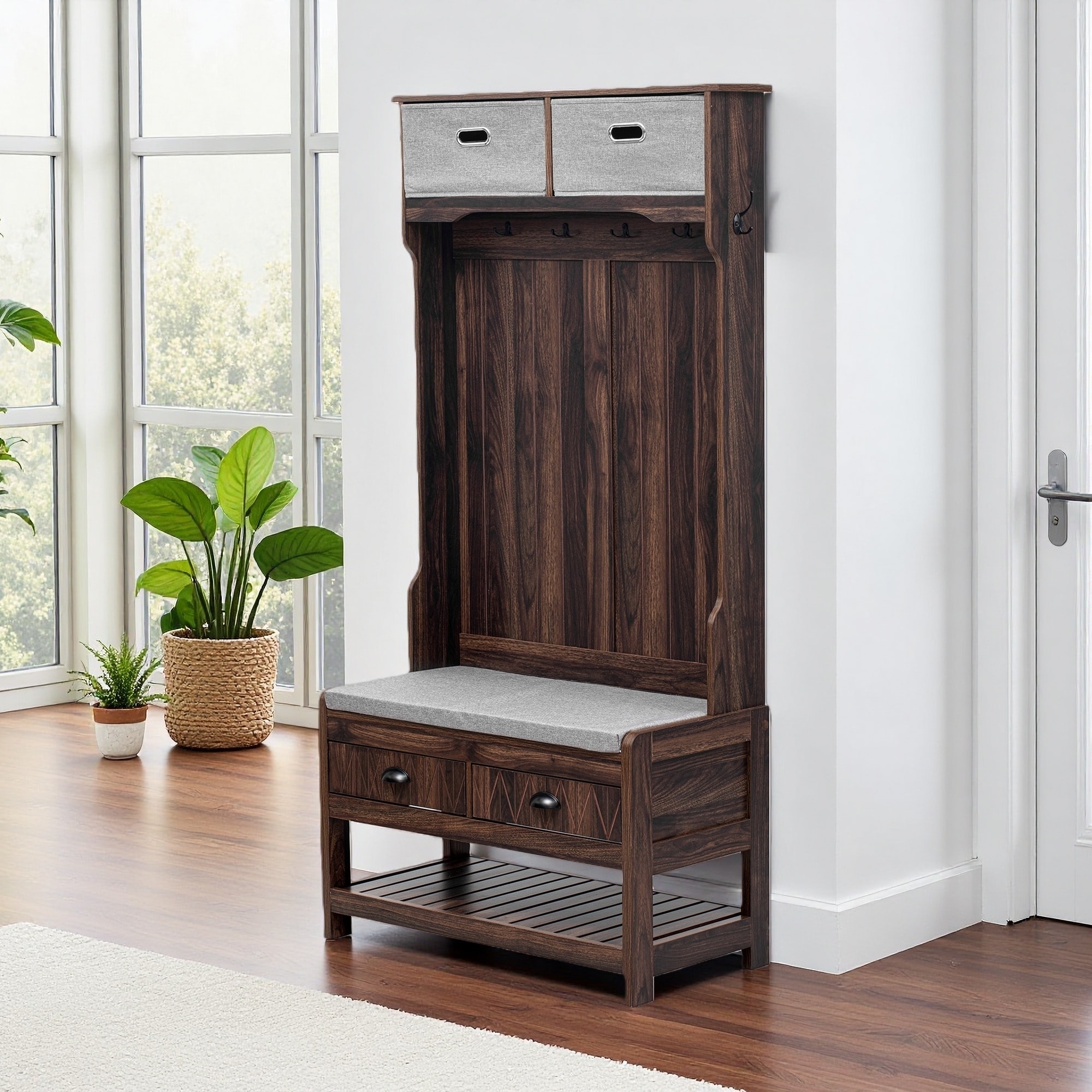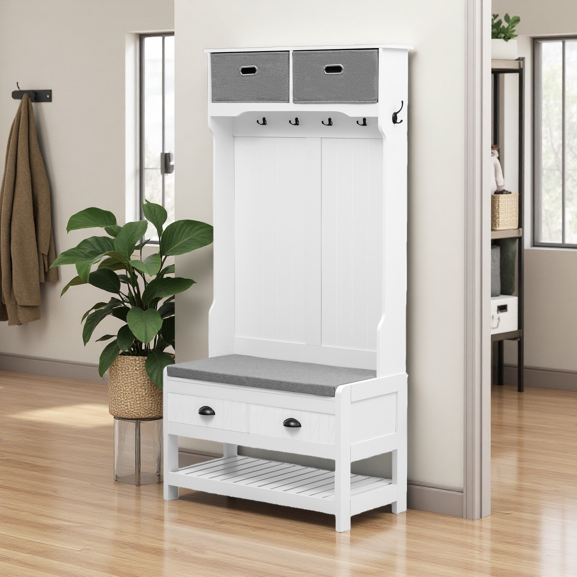 69''H MDF Hall Tree with 6 Hooks, Sliding Drawers & Hinged Lid, Storage Bench with Shoe Storage, 3-in-1 Coat Hanger for Entryway