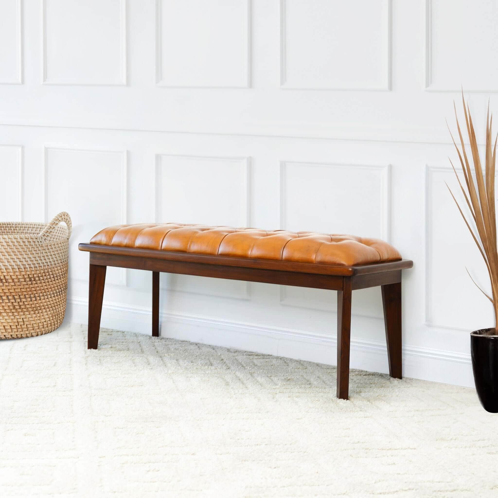 GDFStudio - Arden Modern Genuine Leather Bench with Button Seat & Solid Wood Legs - 49.61"W