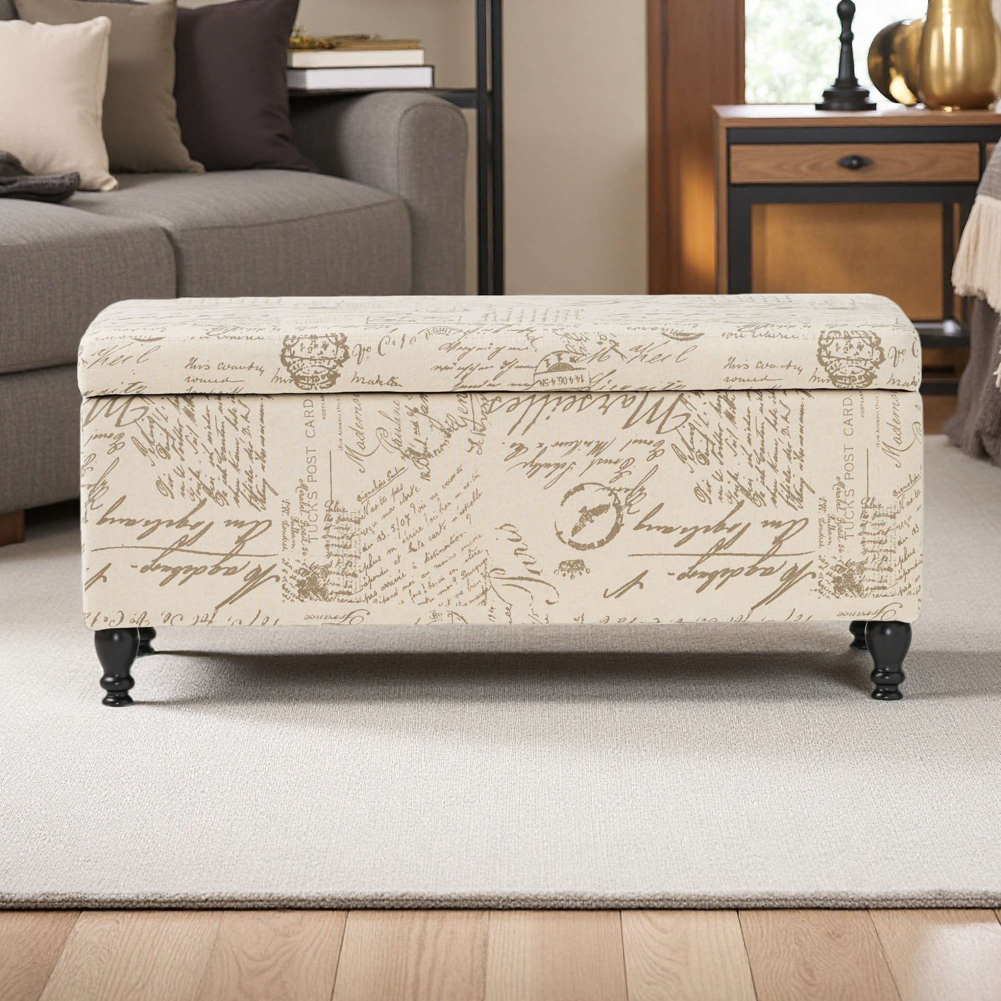 42"L Upholstered Storage Ottoman with Carved Wooden Legs, French Script Fabric Ottoman Bench for Living Room Entryway Bedroom