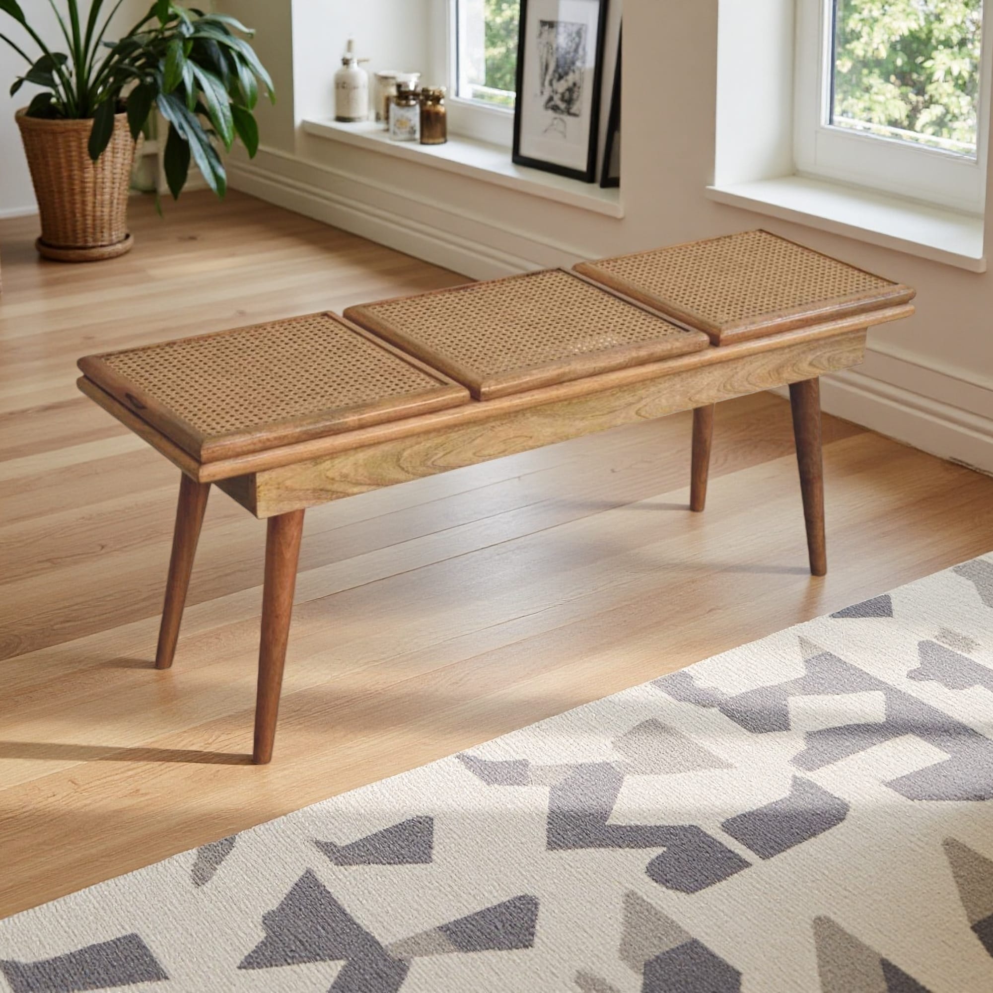 47.24"L Larissa Triple Accent Bench in Solid Mango Wood with Oak-ish Finish and Rattan Detailing