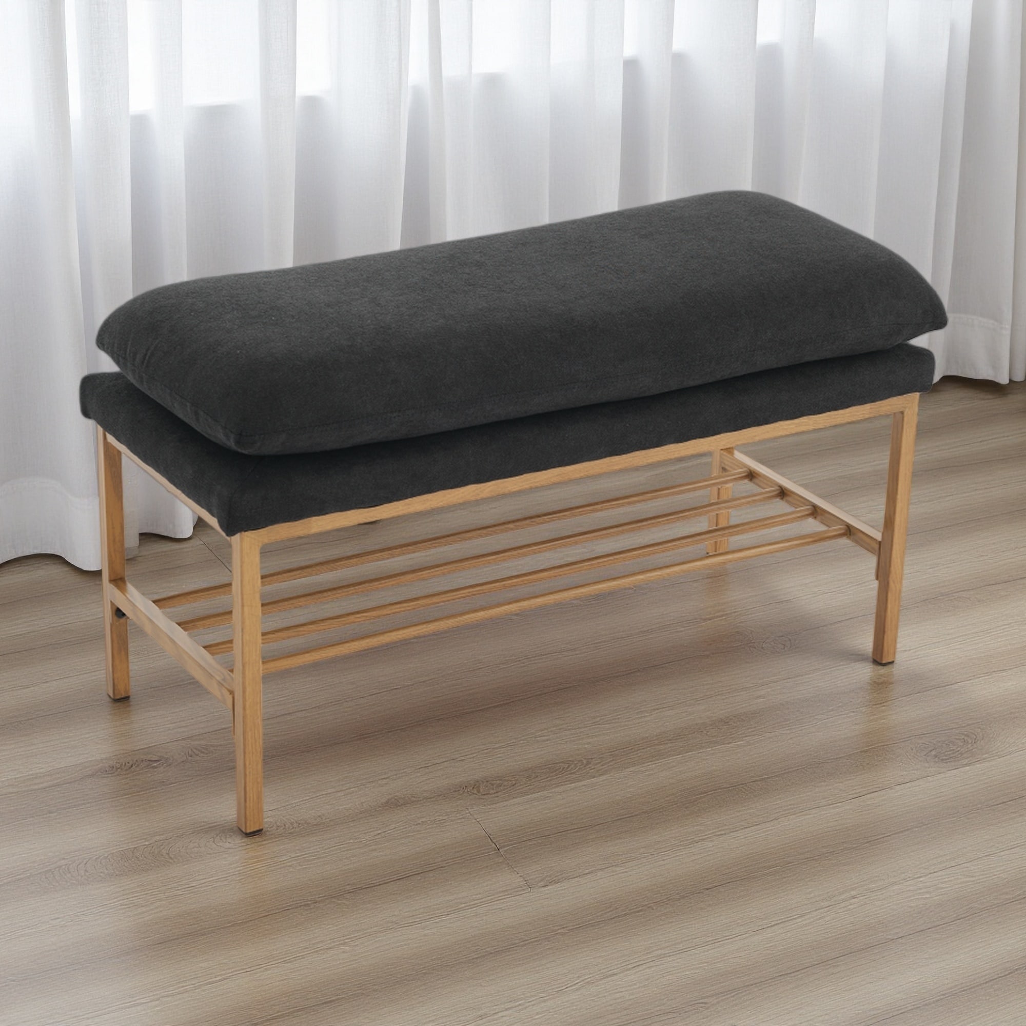 32"L End of Bed Bench with Shelf, Linen Upholstered Storage Shoe Bench, Bedroom Bench with Metal Legs, for Living Room, Entryway