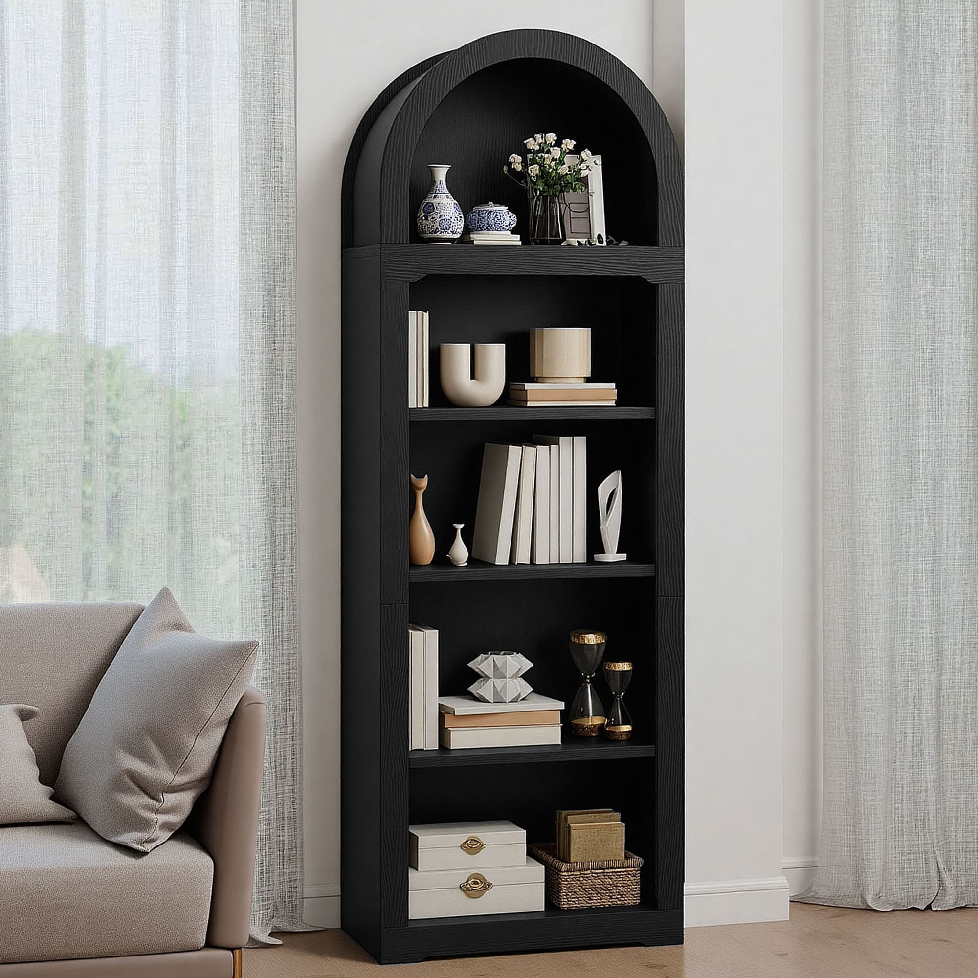 Modern 5-Tier Black Bookshelf with Adjustable Shelves and Curved Frame for Living Room or Office - 72"H x 24"L x 12"W