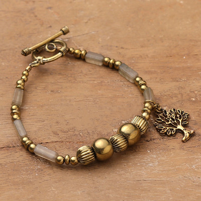 'Tree-Themed Polished Brass and Quartz Beaded Charm Bracelet'