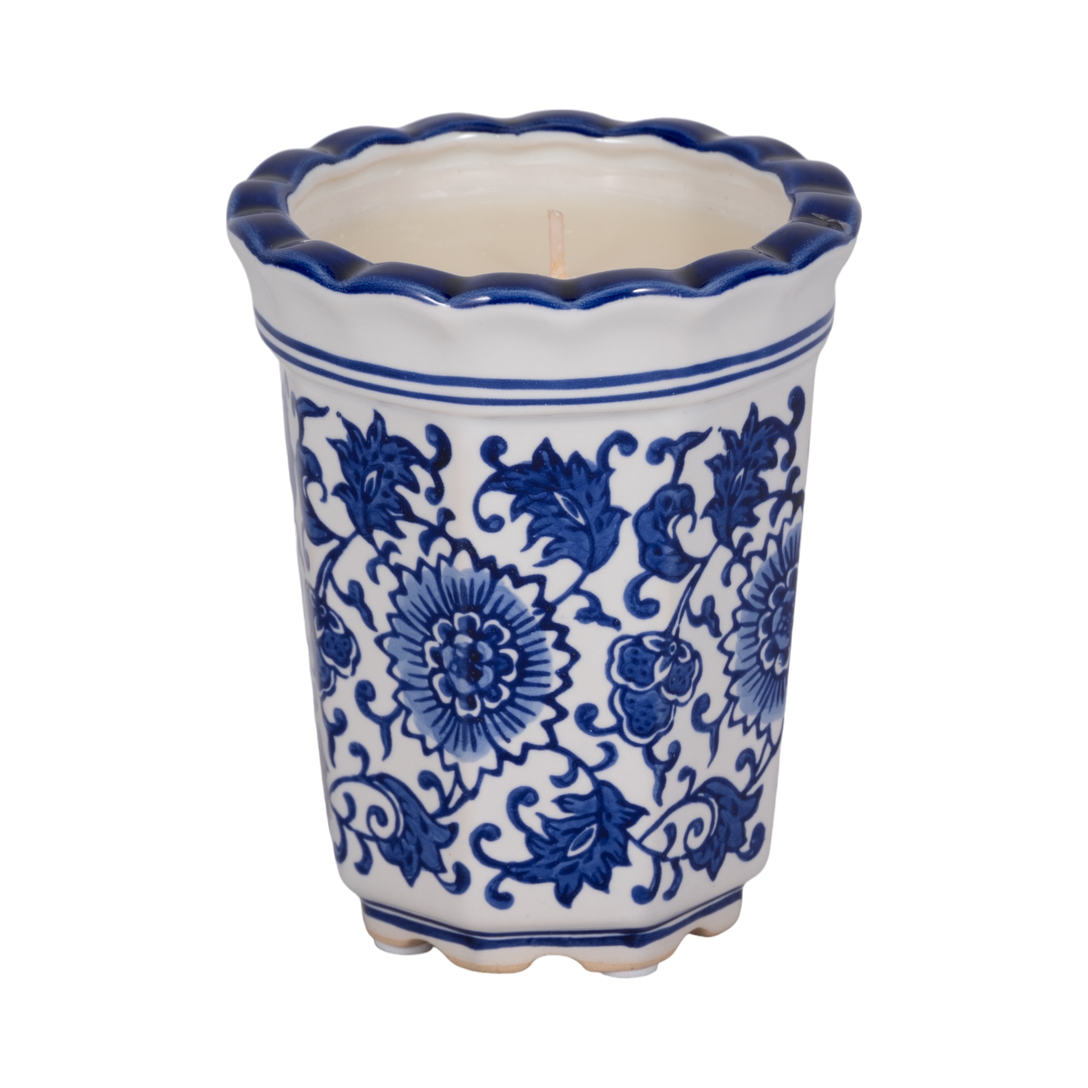 Sagebrook Home Ceramic Wax Fluted Chinoiserie Candle, 4-Inch, 7oz Blue/White - 4" x 4" x 6"