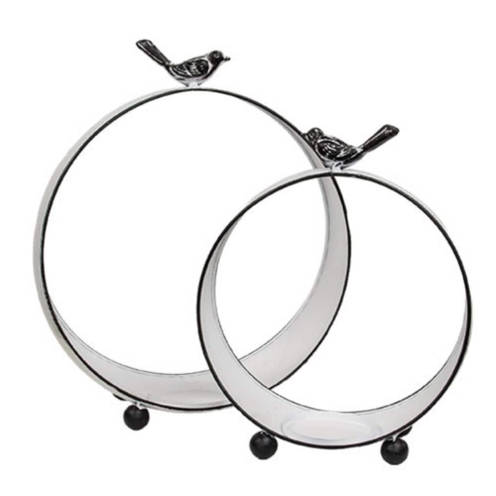 Set of 2 Round Metal Pillar Lanterns with Bird Tops for Indoor and Outdoor Decor Display