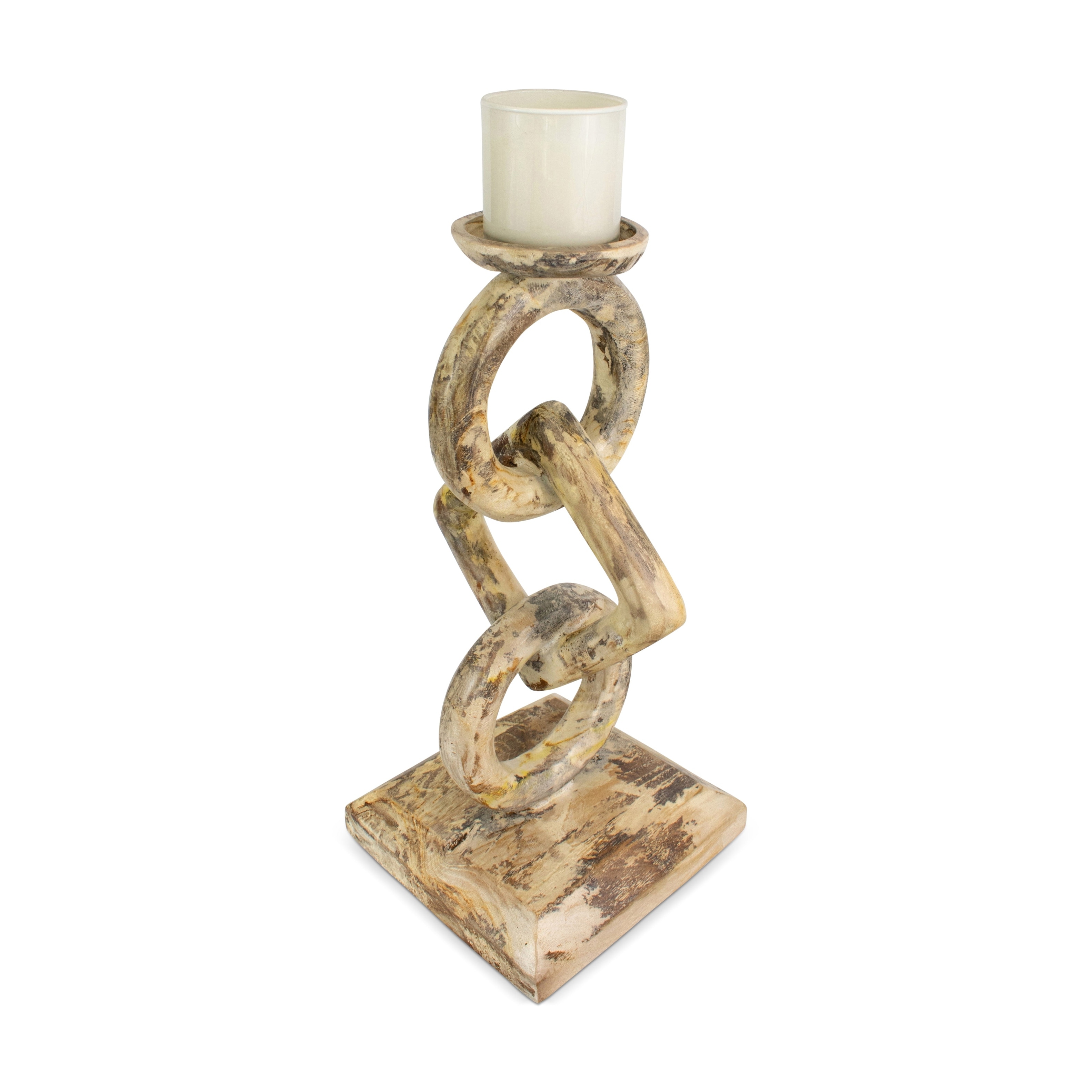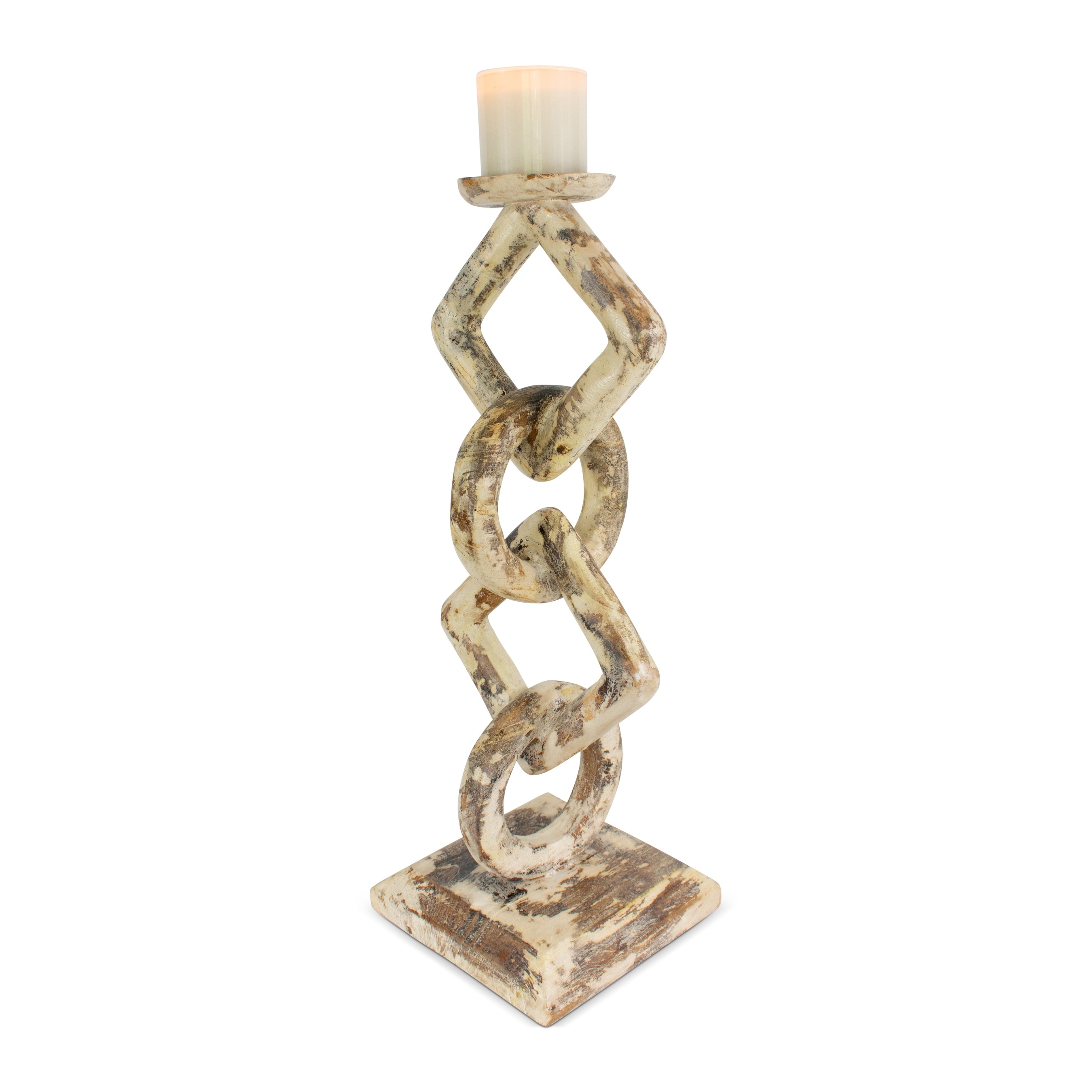 Wood Chain Link Candle Holder Hand Carved Rustic Whitewashed Candle Stand, Decorative Accent