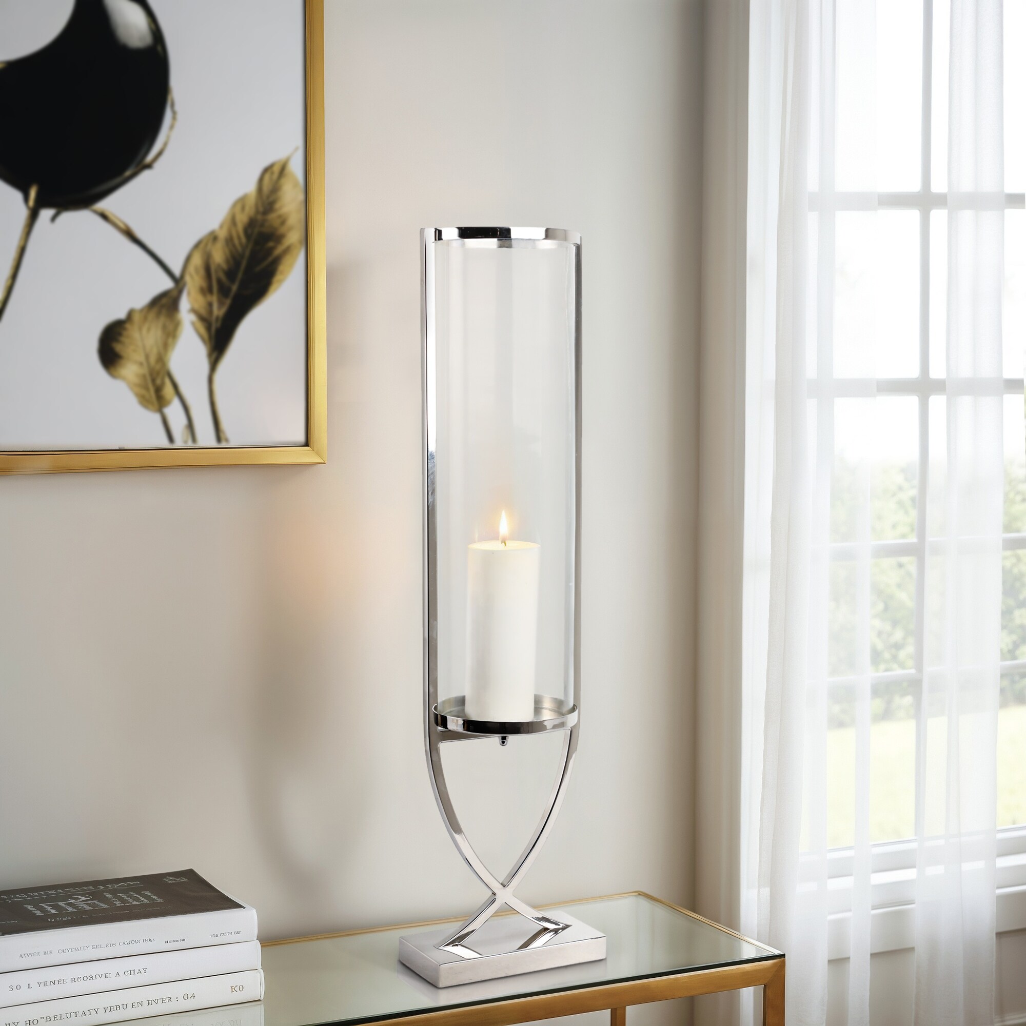 Modern Glass Pillar Candle Holder Decorative Lantern with Steel Frame