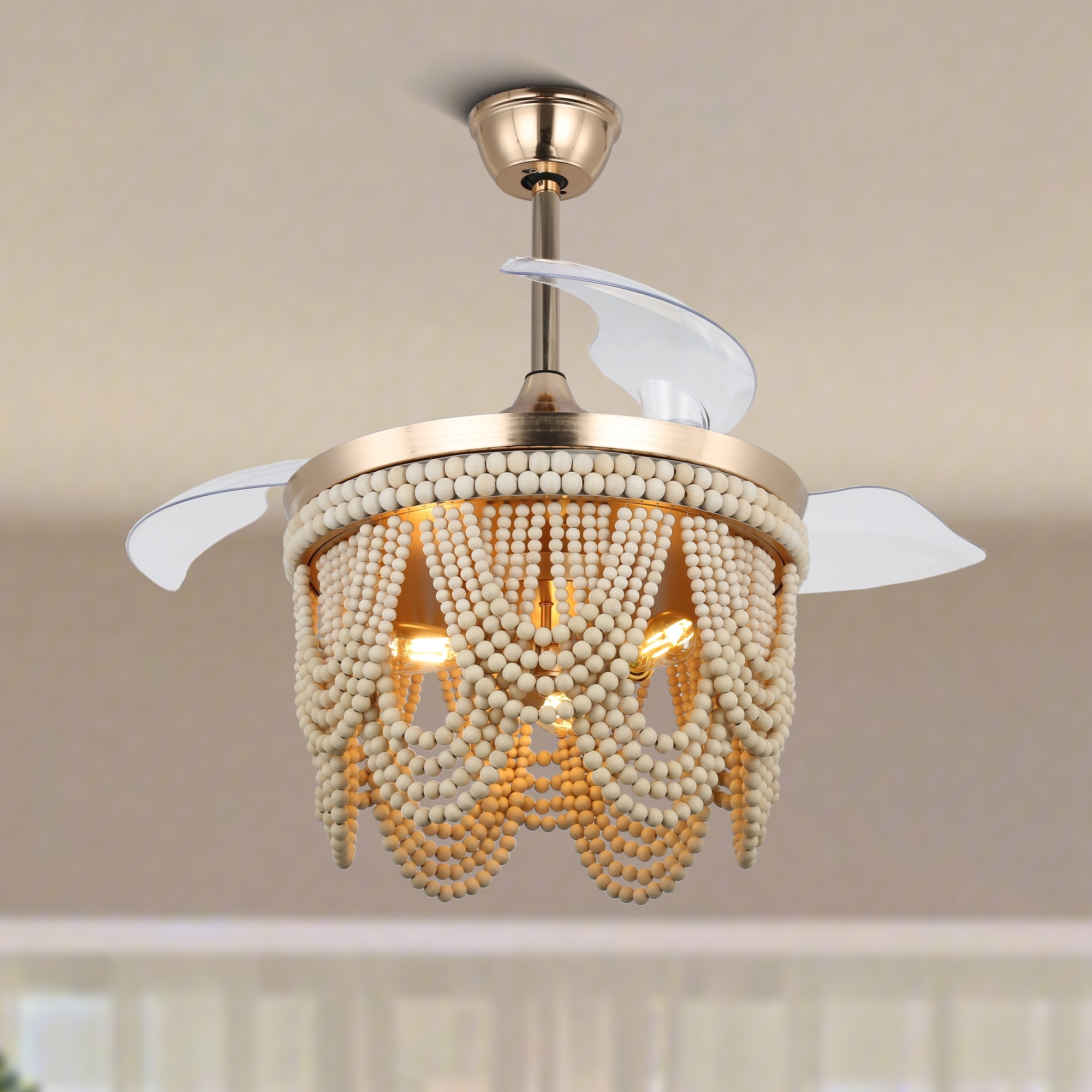 CurveCurio 42" BoHo Ceiling Fanlight with Retractable Blades and Wooden Beads Accents, 6 Speed Reversible DC Motor w Remote