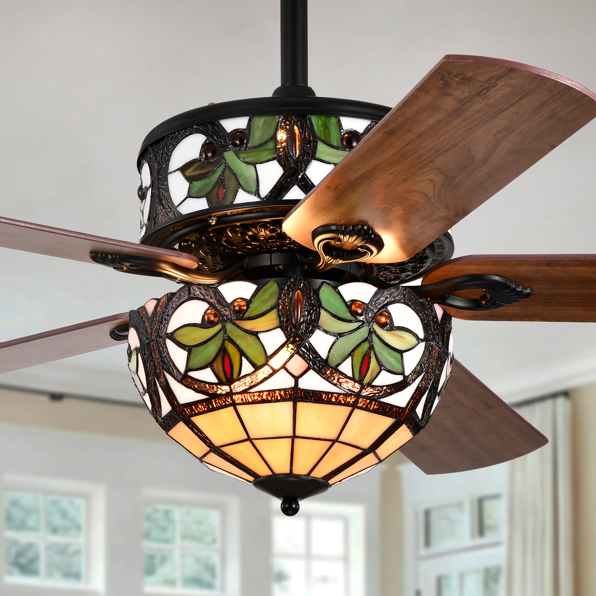 Temid 5-Blade Lighted Ceiling Fan 2-Tier Tiffany Style Glass