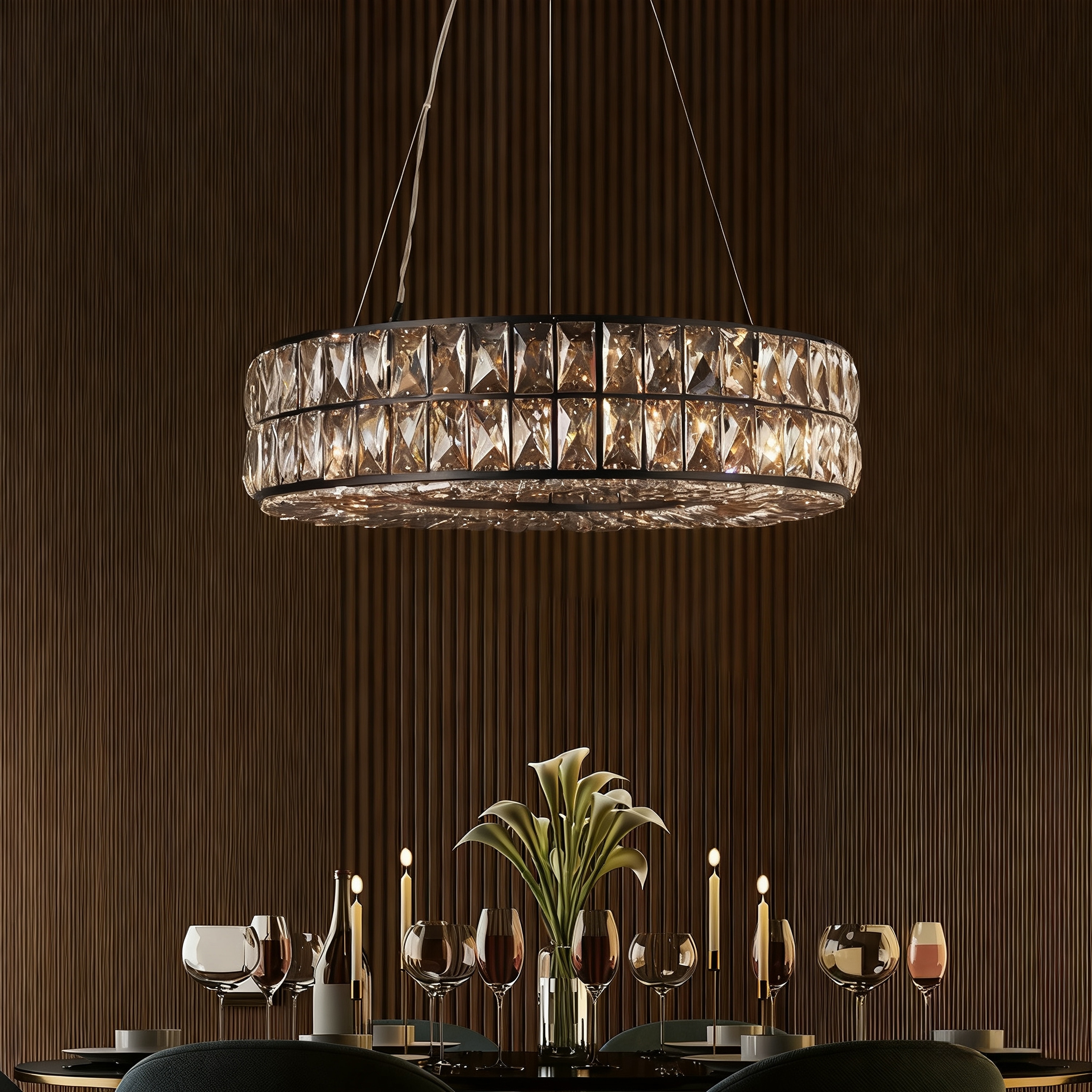Modern Glam 8-Light Crystal Chandelier Black Drum Ceiling Light for Dining Room - D21" x H66"