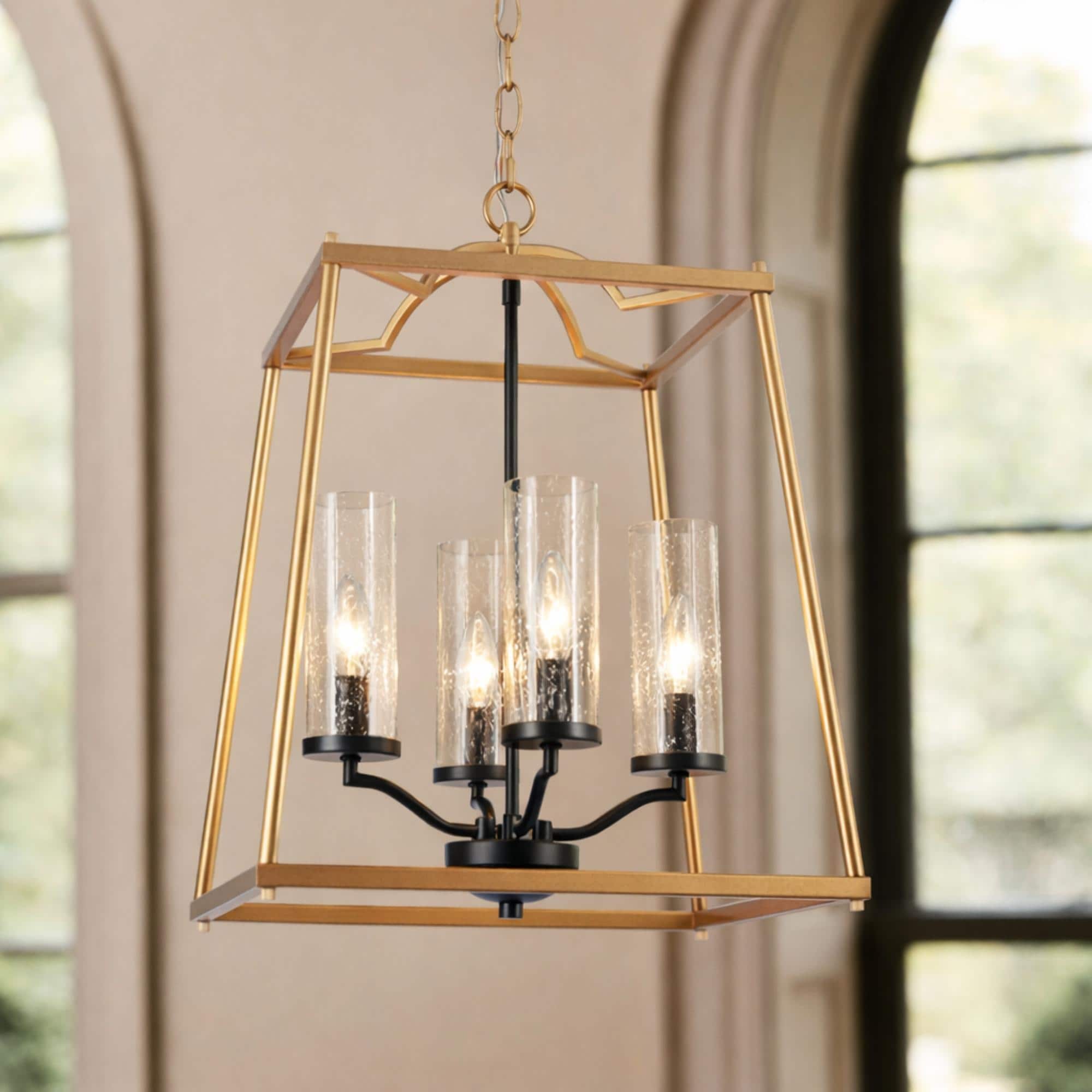 Modern 4-Light Gold Glass Chandelier Lantern Pendant Light for Dining Room - 14" L x 14" W x 19" H