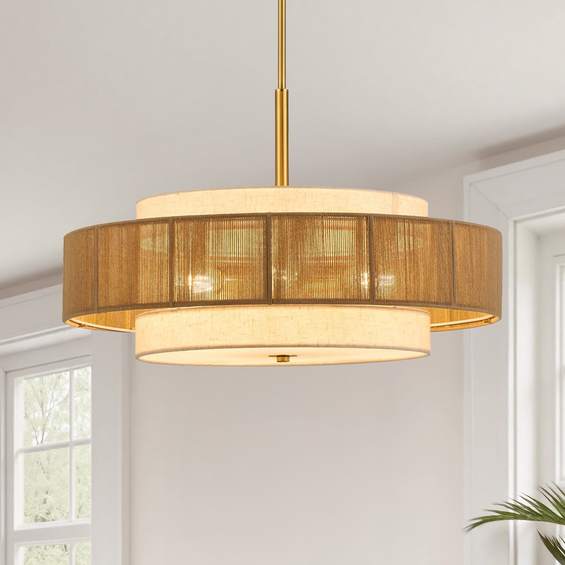 5-Light Mid-Century Modern Brass Chandelier for Dining Room&Living Room - Four-Layer Textured Fabric Shade - 5 Light