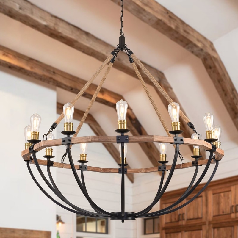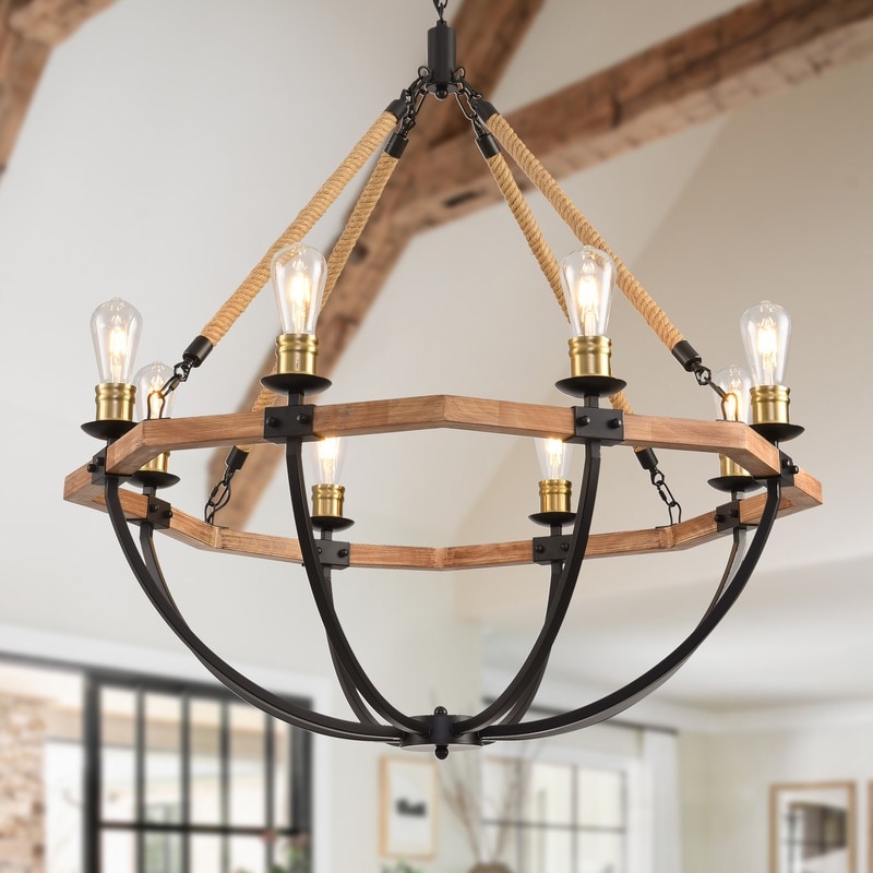 Farmhouse Empire Chandelier,Wood Rustic Pendant Ceiling Light, Wagon Wheel Chandelier with Hemp Rope
