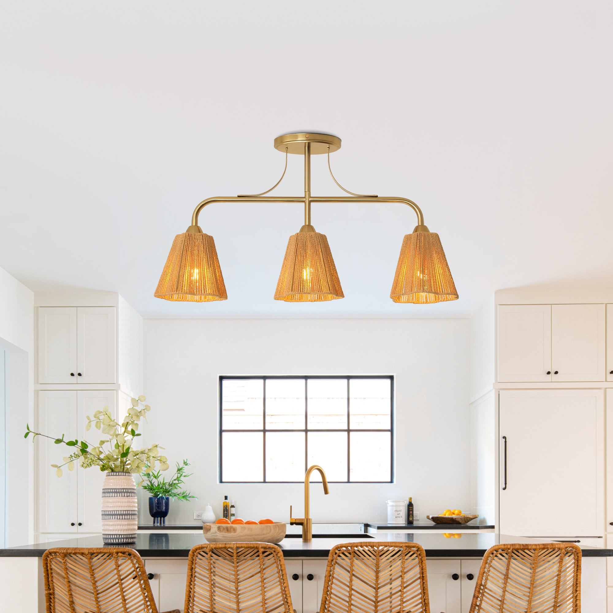 Farmhouse Brown Paper Rope Shade 3-Light Gold Linear Chandelier Light