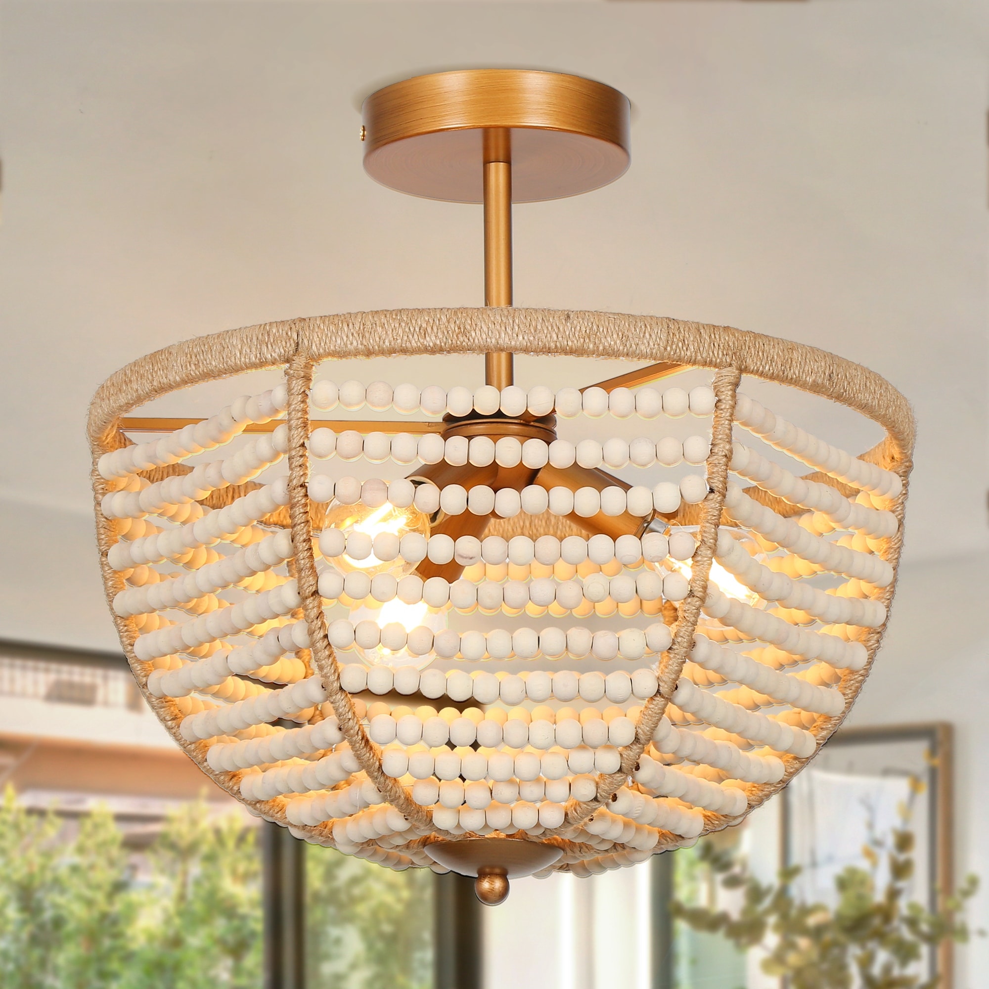 Farmhouse Boho Beaded 3-Light Chandelier Coastal Semi-flush Mount Ceiling Light for Entryway - Dia. 14" x H 13.7"