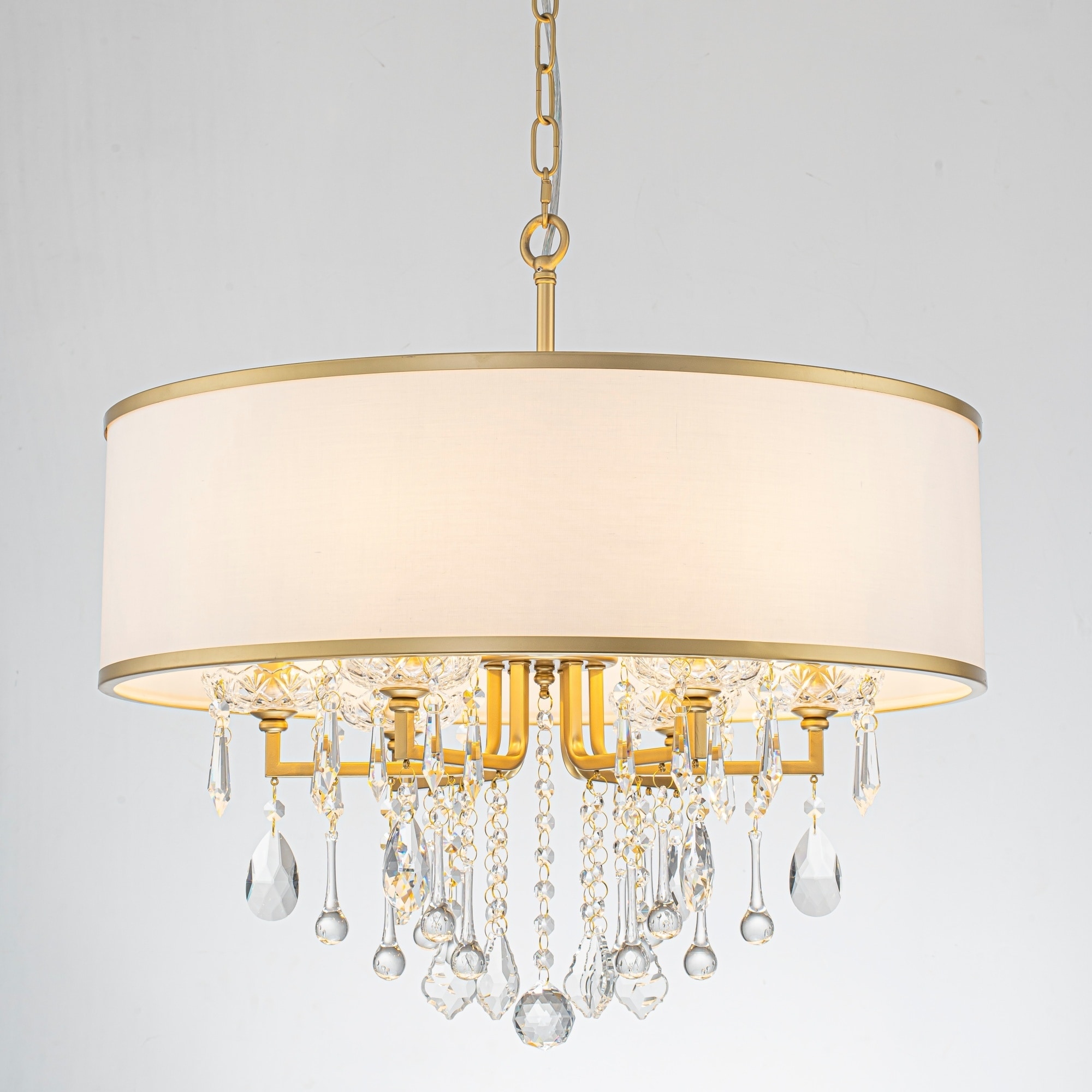 6-Light Modern Elegant Gold Drum Fabric Shade Adjustable Height with Crystal Accent Chandelier for Dining Room & Bedroom