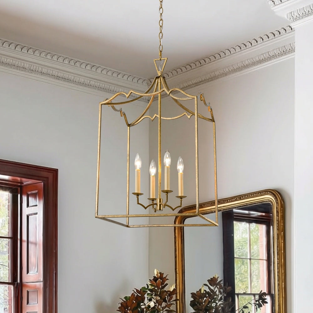 Vintage 4-Light Candle Aged Gold Iron Square Cage Pendant Lantern