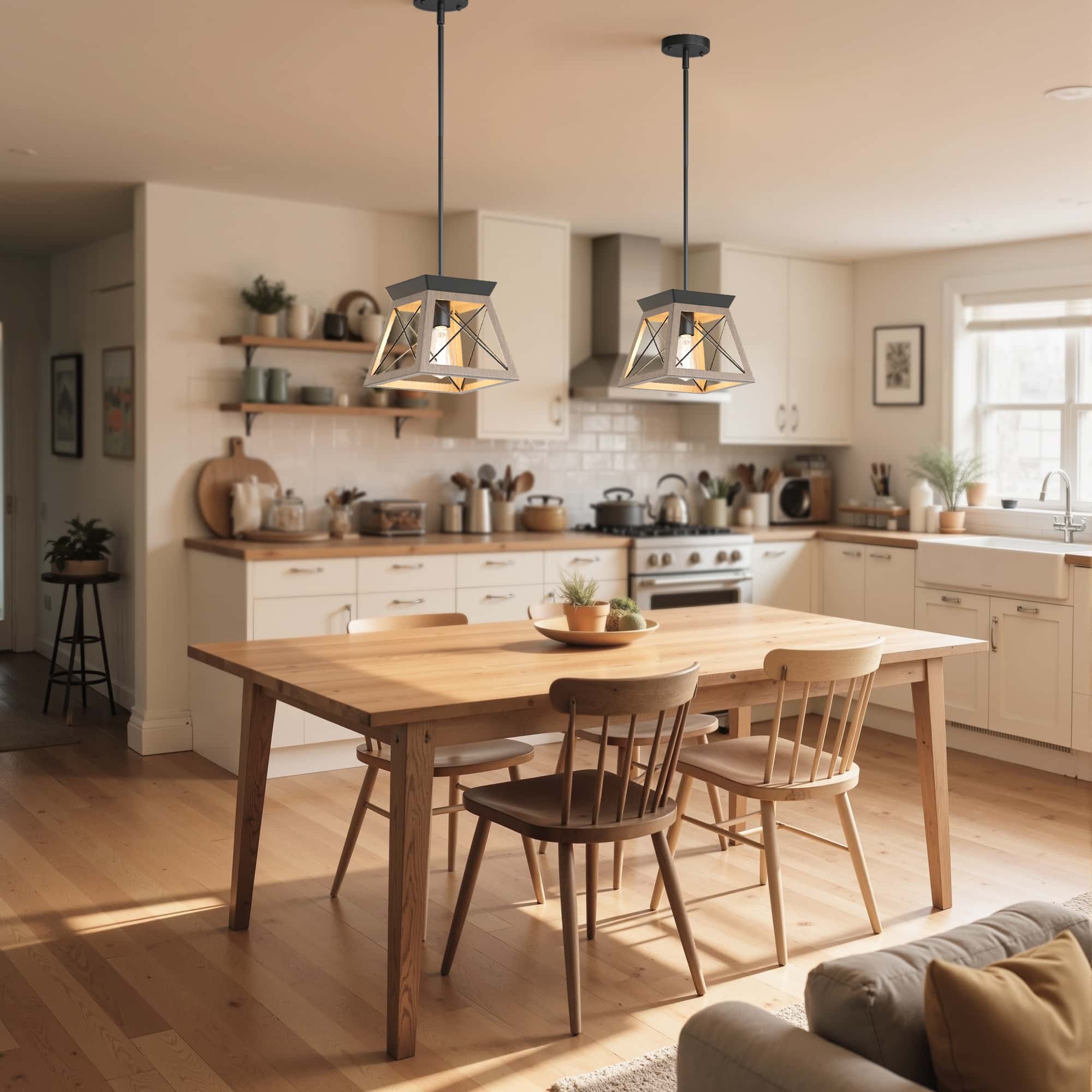 YANSUN Light Wood Industrial Pendant Light with Iron Rods, Adjustable Height