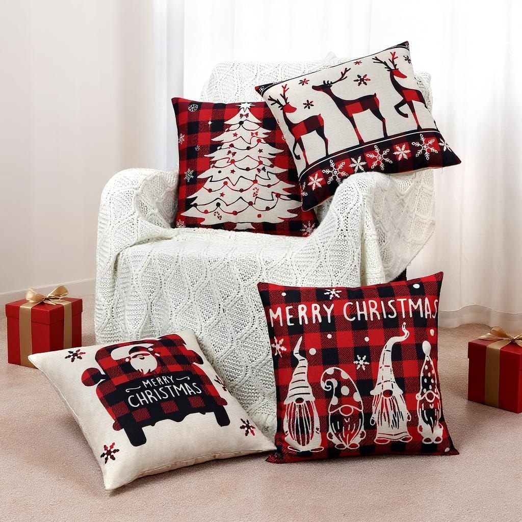 4PCs Christmas Red Plaid Throw Pillow Covers for Couch Sofa Bed, 18x18 Inch