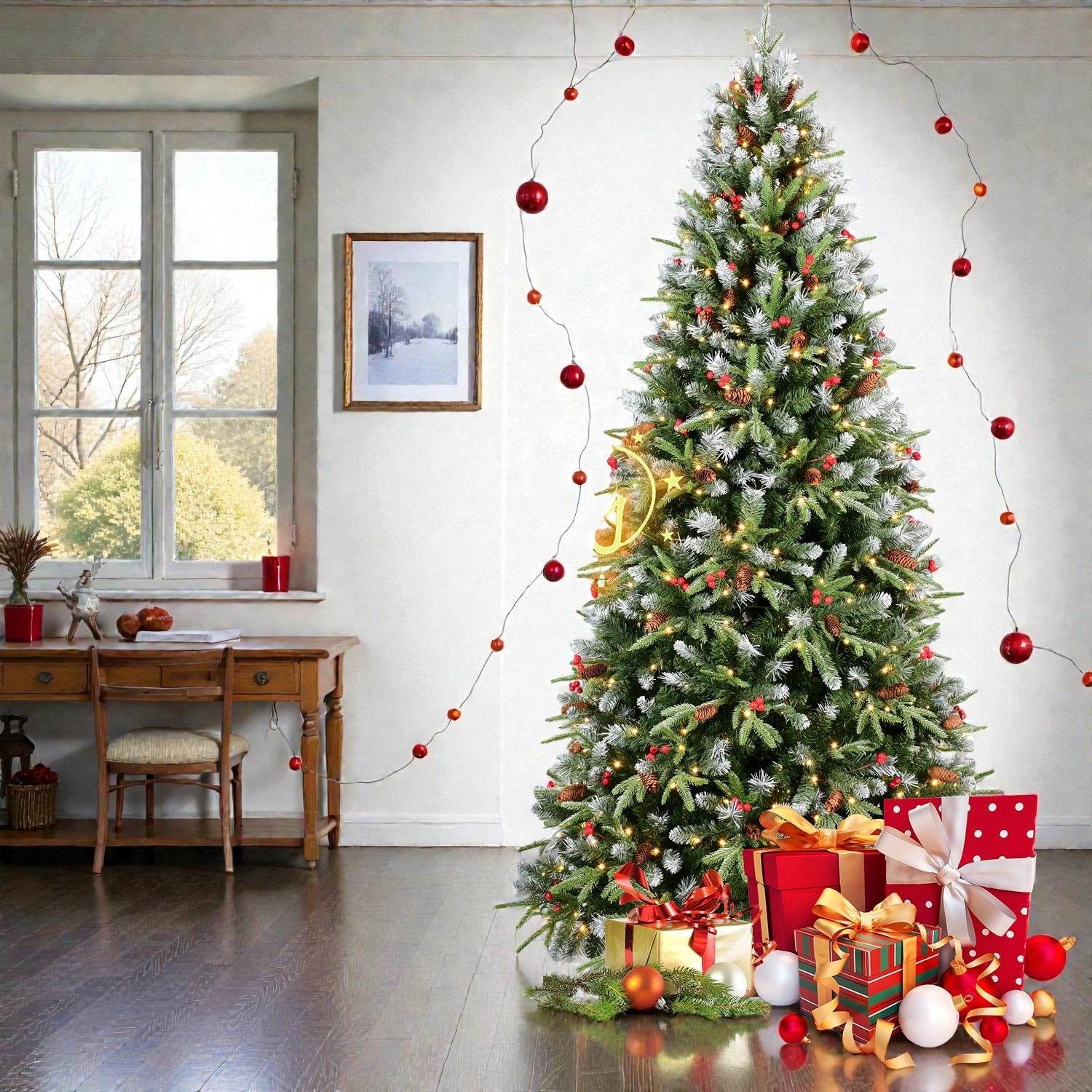 Pre-Lit Artificial Christmas Tree with Berries Pine Cones and Warm LED Lights, Hinged Branches, 4FT to 9FT - Green,White