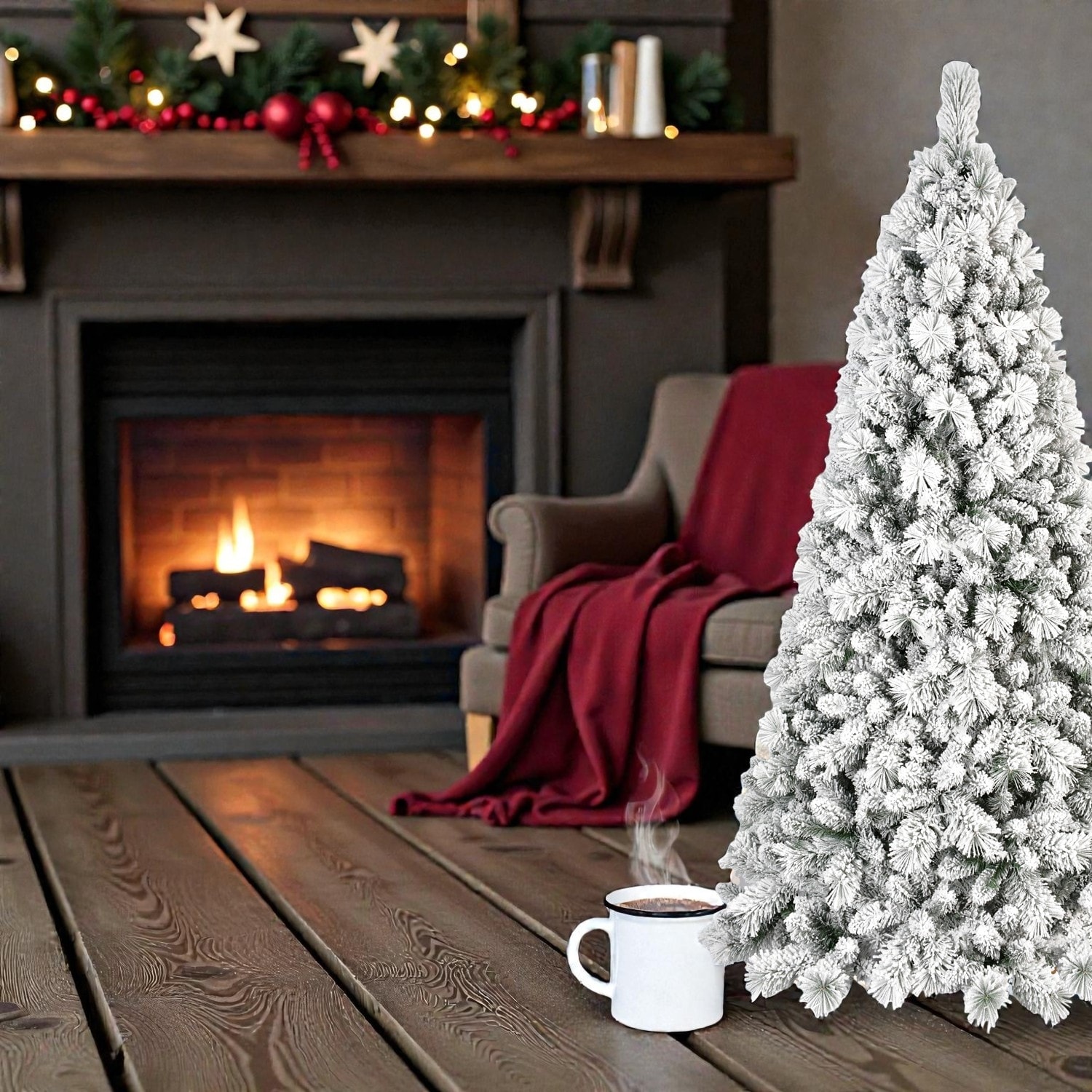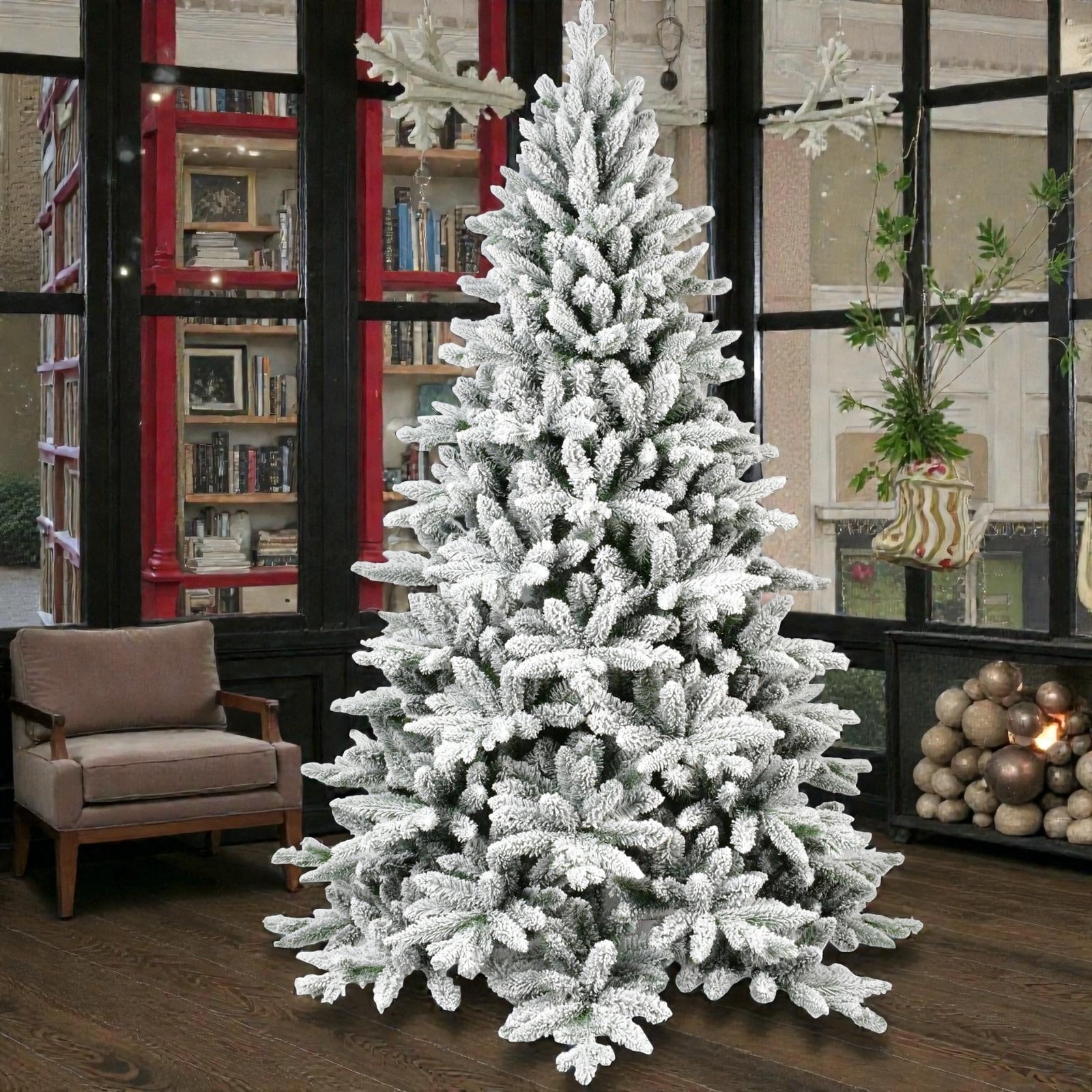 7FT Flocked Christmas Tree with 1514 PE+PVC Tips, Full Snowy Hinged Pine Tree with Metal Stand for Holiday Decoration - White