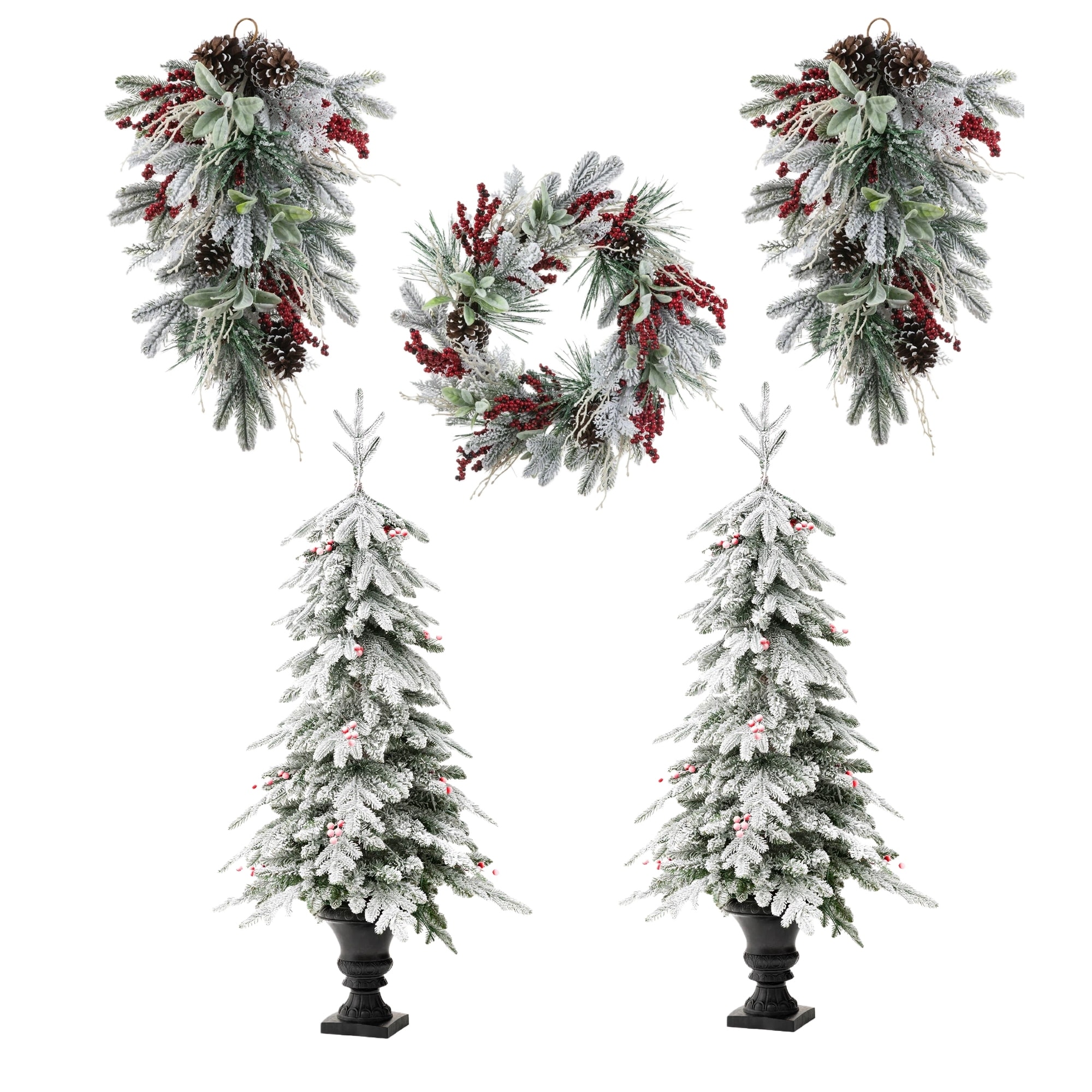 Glitzhome Artificial Christmas 5-Piece Set, 4ft Snow Flocked Artificial Potted Trees, Pinecone Berry Wreath and Teardrops
