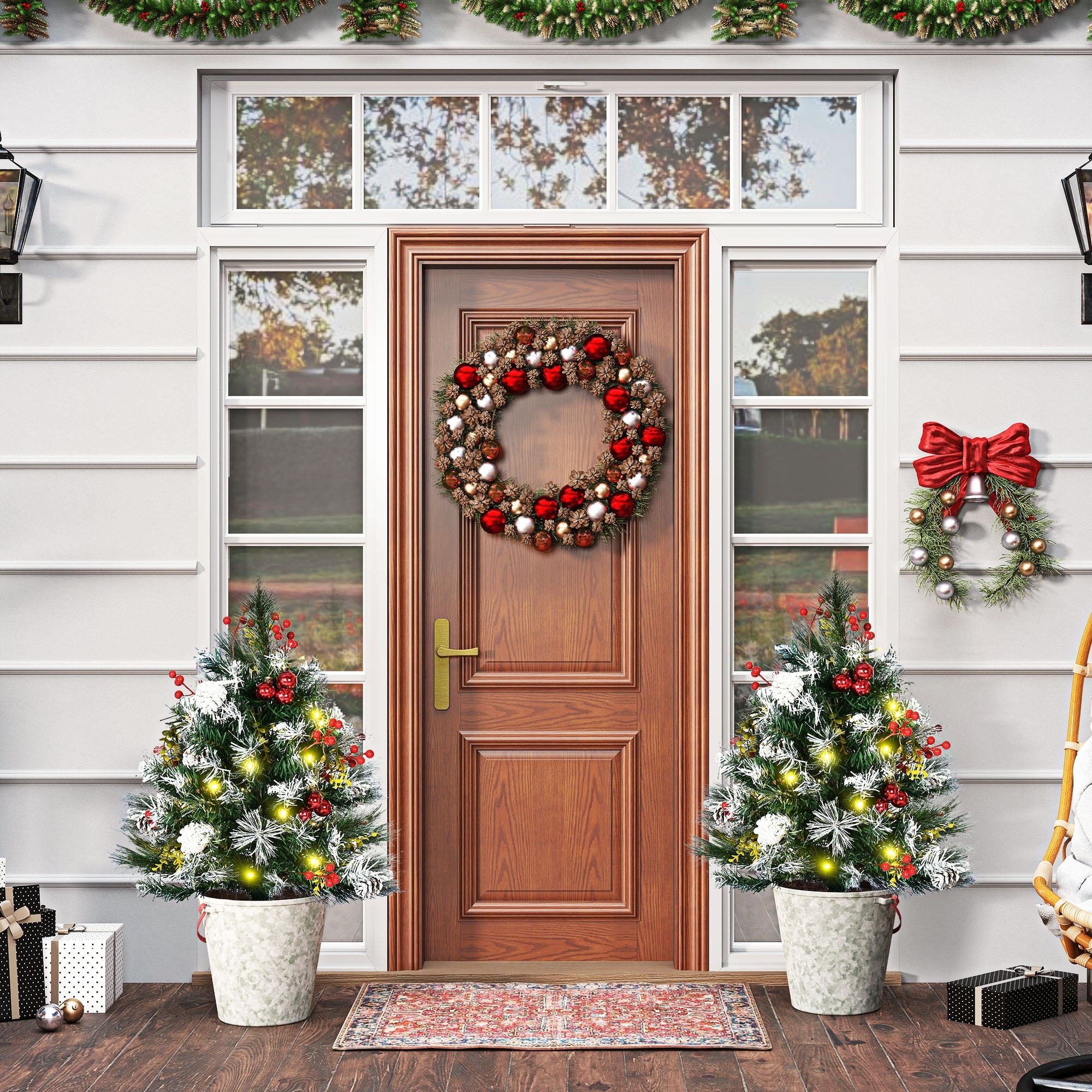 Glitzhome Artificial Christmas 5-Piece Set, 4ft Snow Flocked Artificial Potted Trees, Pinecone Berry Wreath and Teardrops