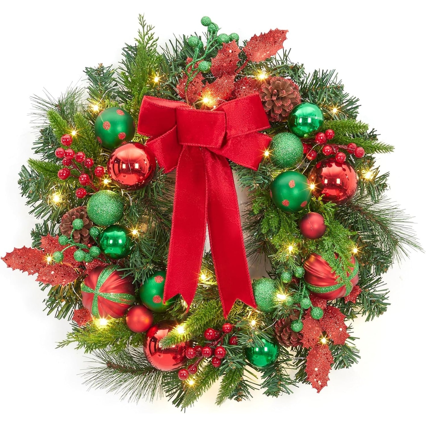 22" Pre-Lit Christmas Wreath with Red Bow, Red & Green Balls & Berries, Battery LED Holiday Door Decor