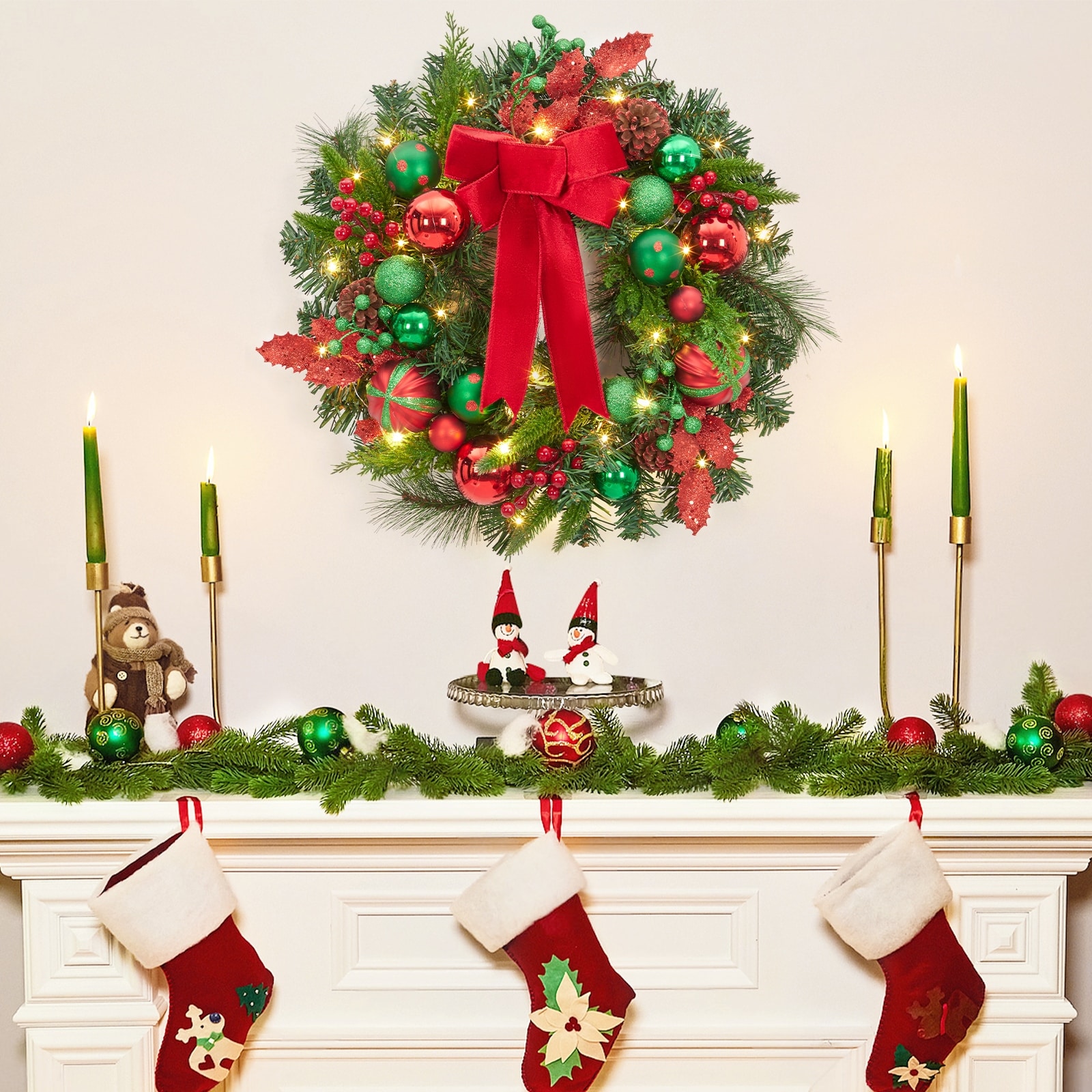 22" Christmas Wreath with Lights, Pre-Lit Xmas Wreaths for Front Door Fireplace Wall Holiday Decor
