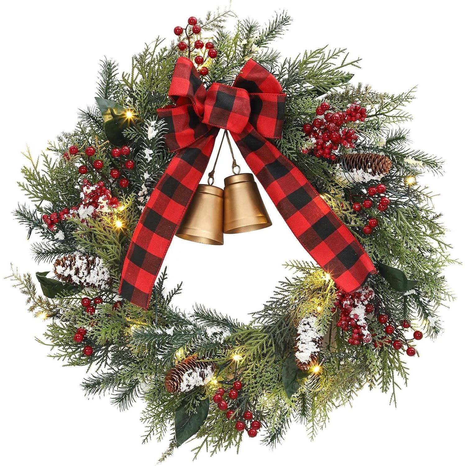 24 Inch Lit Christmas Wreath with Bells & Bow for Front Door, Window, Indoor