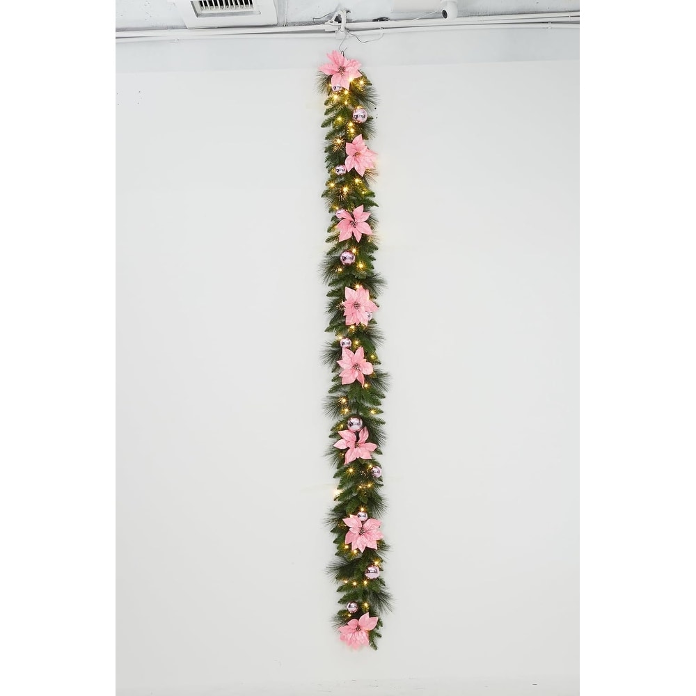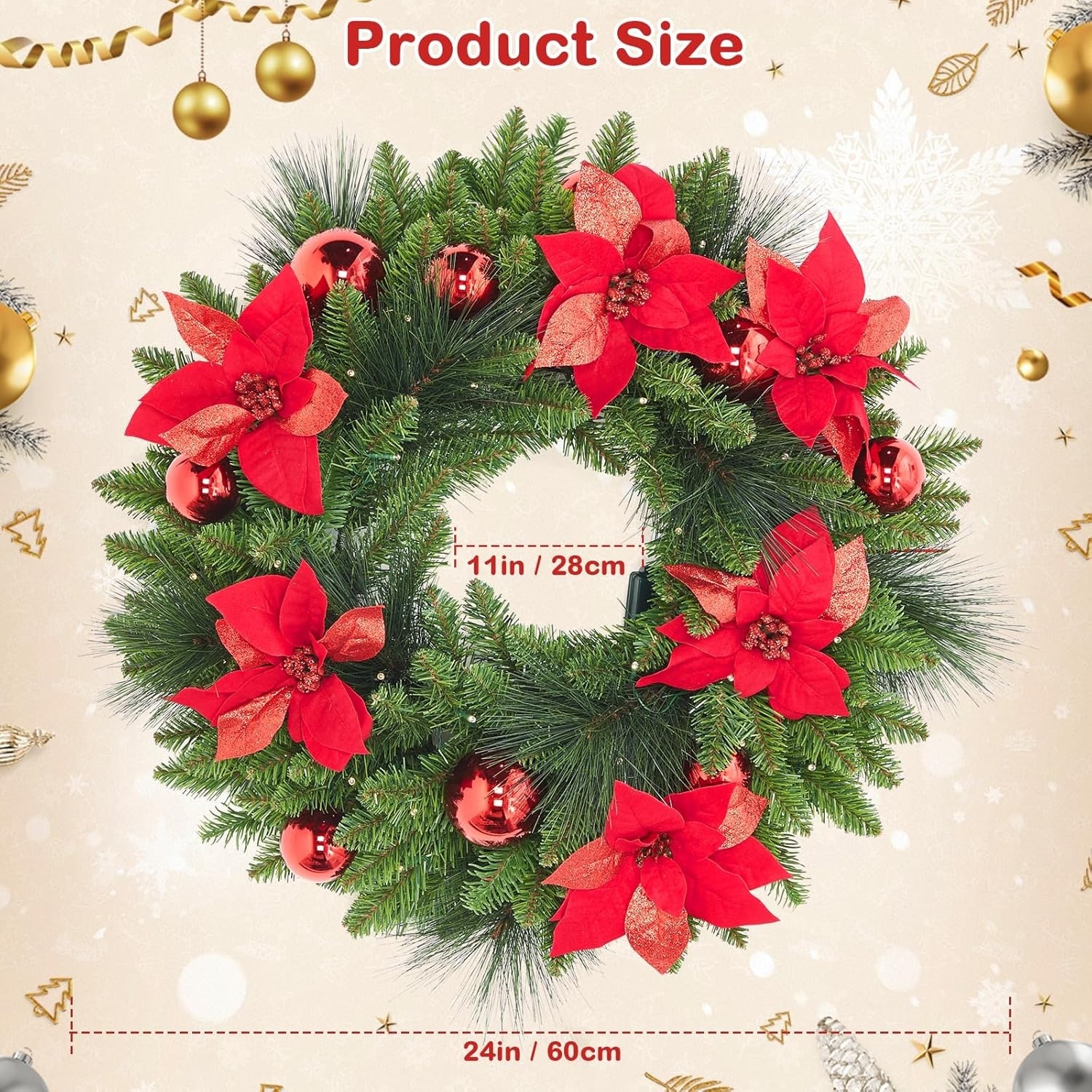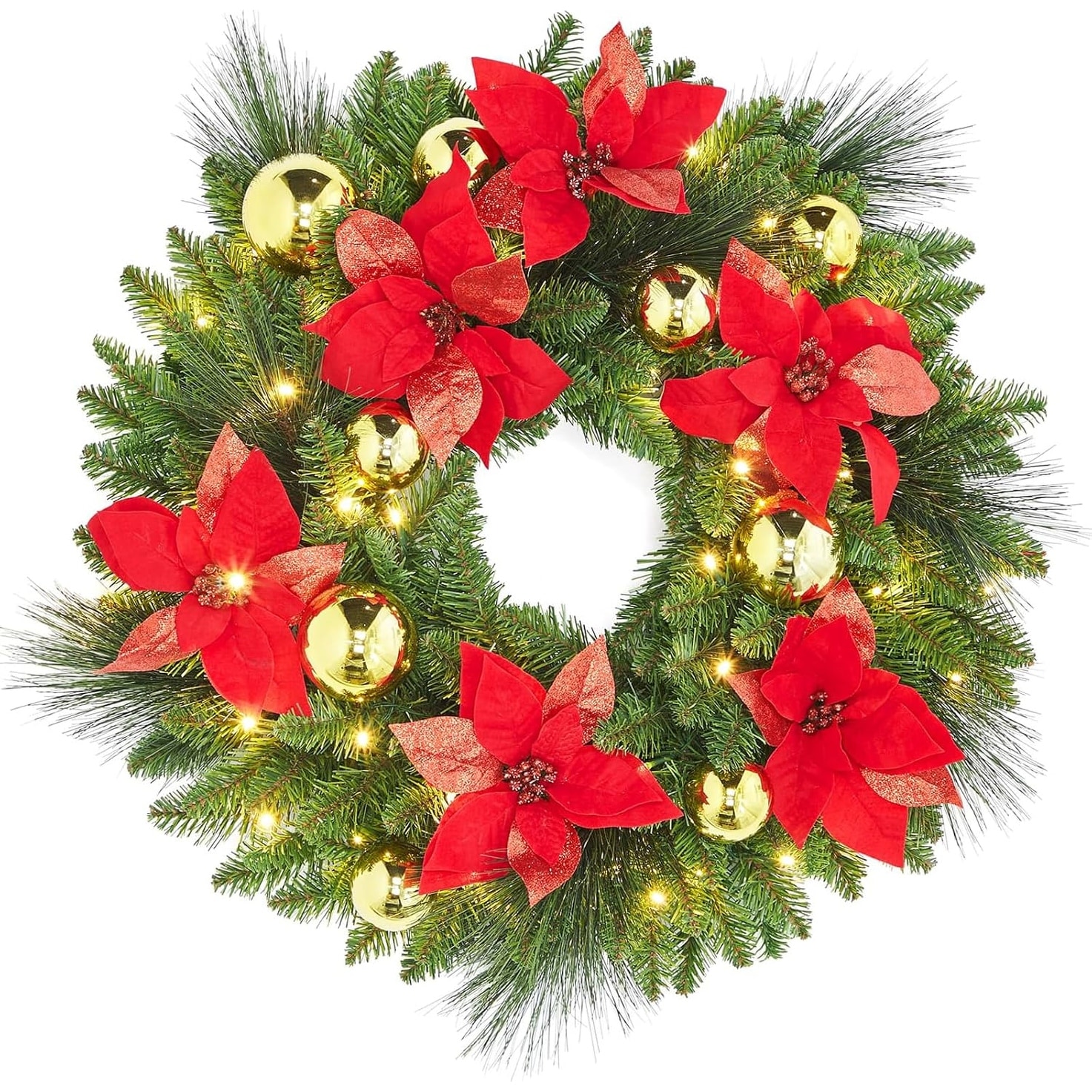 24" Pre-Lit Christmas Wreath with 50 Warm LED Lights, Frosted Pine Cones & Berries for Door or Wall Decor
