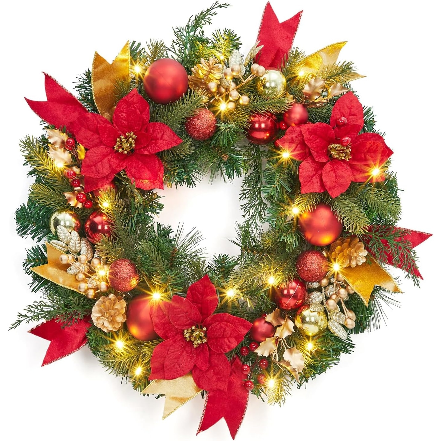 GIMMYFIVE Pre-Lit Christmas Wreath for Front Door, 24 Inch Large Xmas Wreath for Holiday Decor