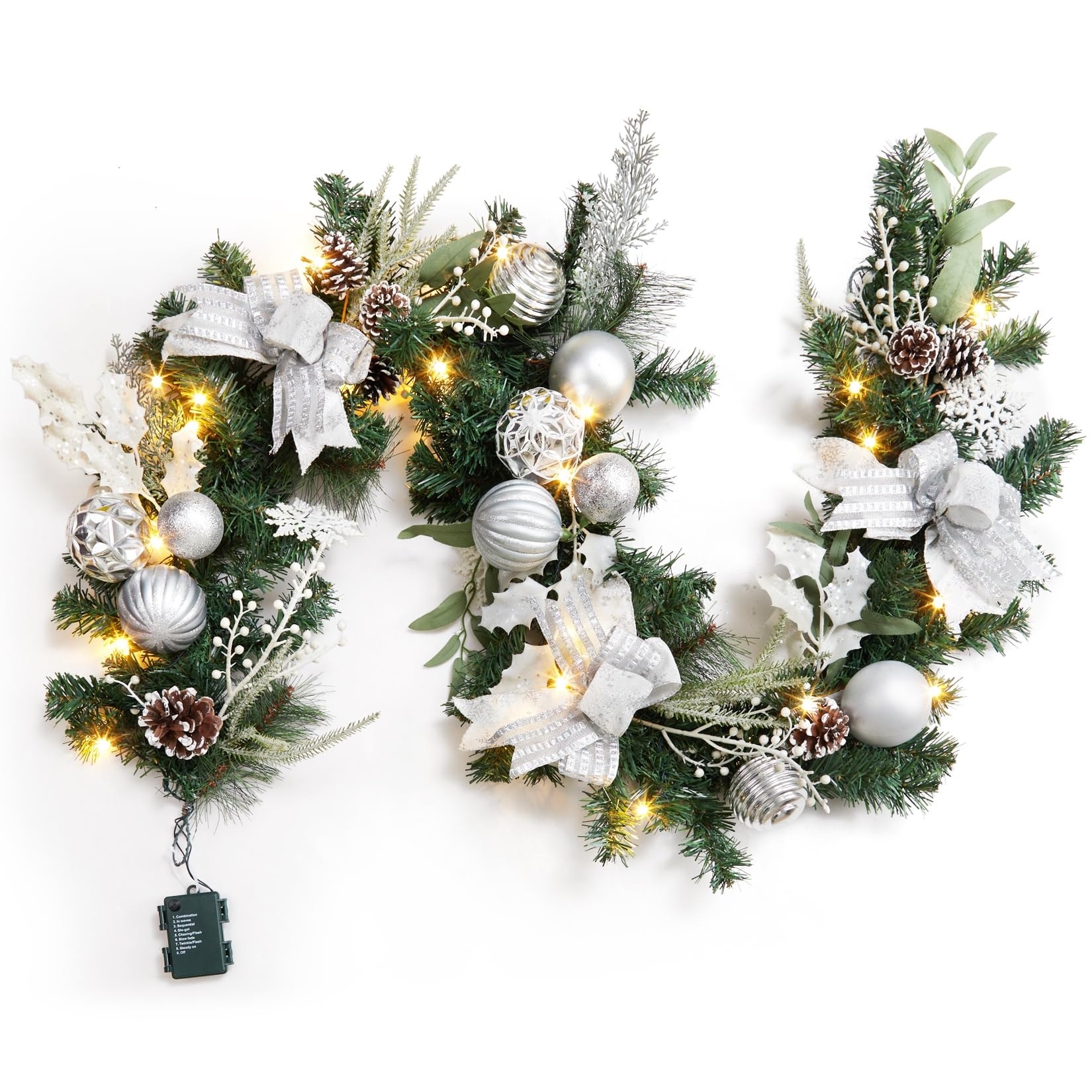 6ft Silver White Christmas Garland with Lights Ball Ornaments for Fireplace Mantle Stair Railing