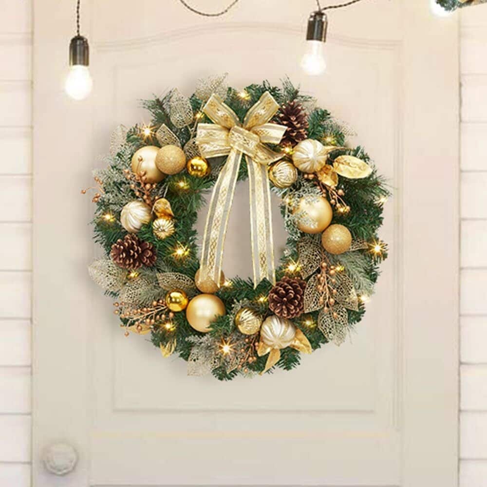 4Pre-lit Christmas Wreath with Warm White Lights and DIY Ornaments for Front Door Gate Wall Xmas Party Decorations