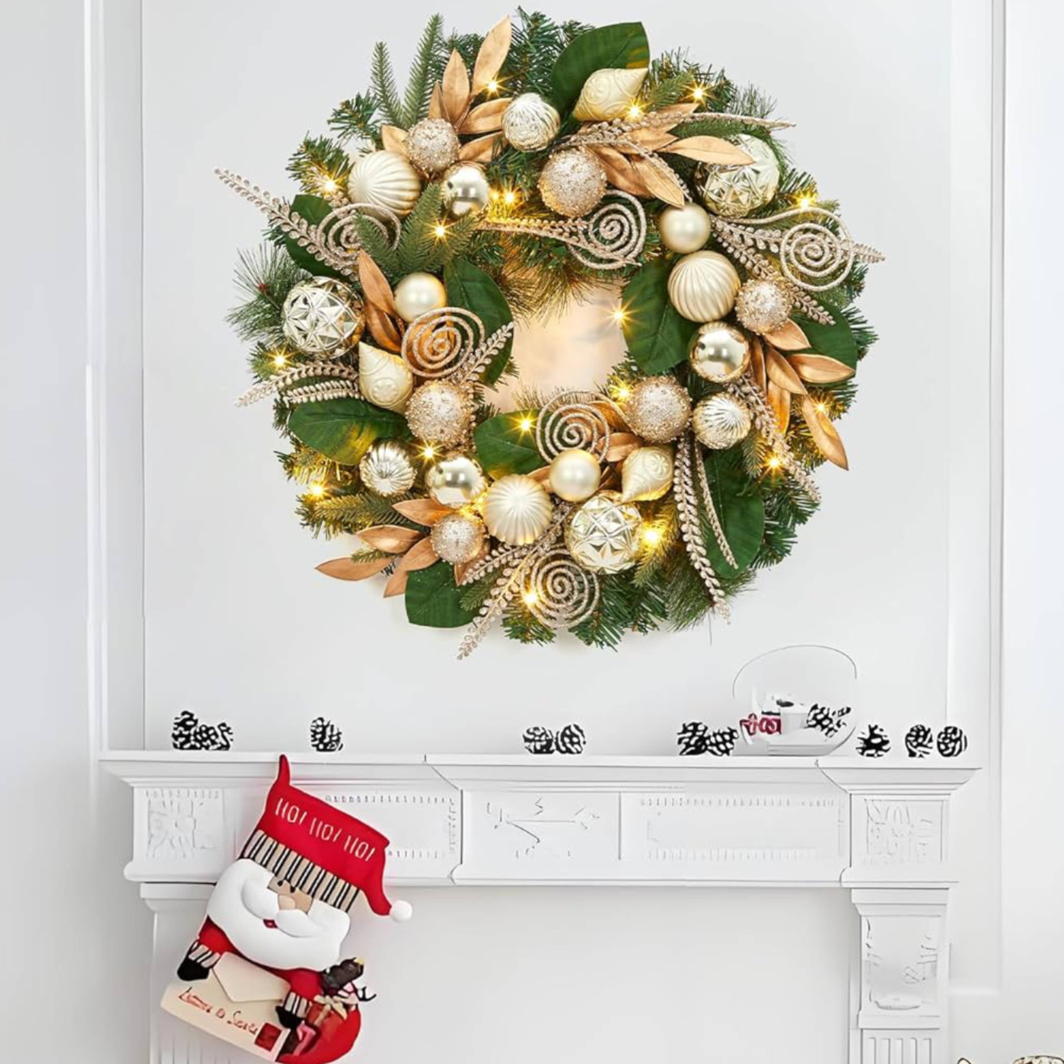 4Pre-lit Christmas Wreath with Warm White Lights and DIY Ornaments for Front Door Gate Wall Xmas Party Decorations