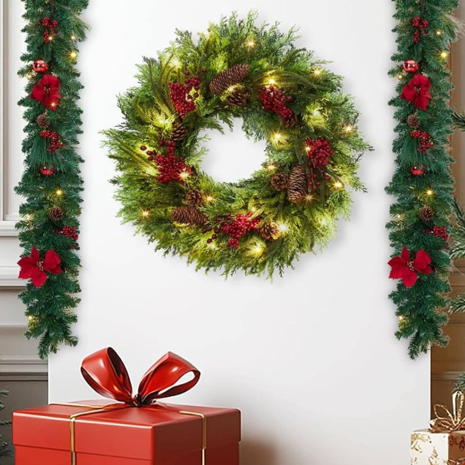22 Inch Christmas Wreath Front Door, Pre-Lit Xmas Wreath with Red Berries - N/A