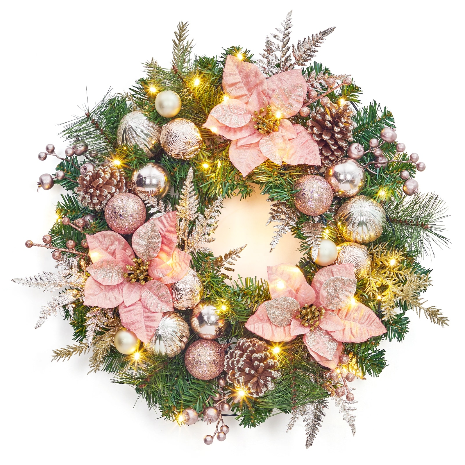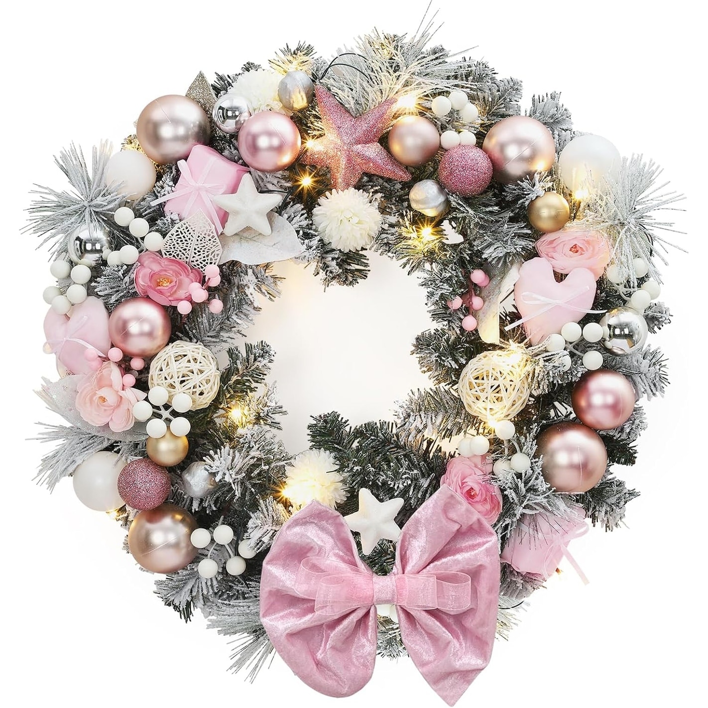 GIMMYFIVE 24 in Christmas Wreath with Pink Bow, Artificial Frosted Pine Needles Christmas Decorations with LED Lights