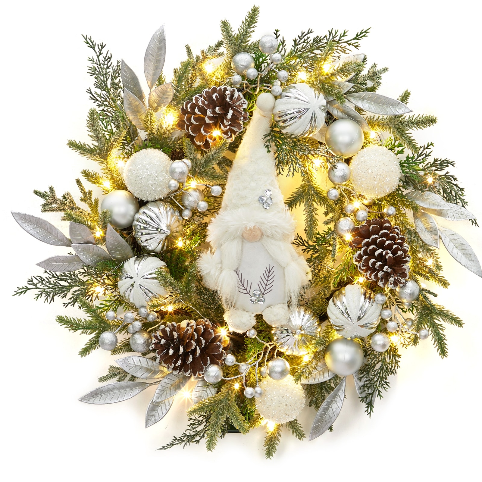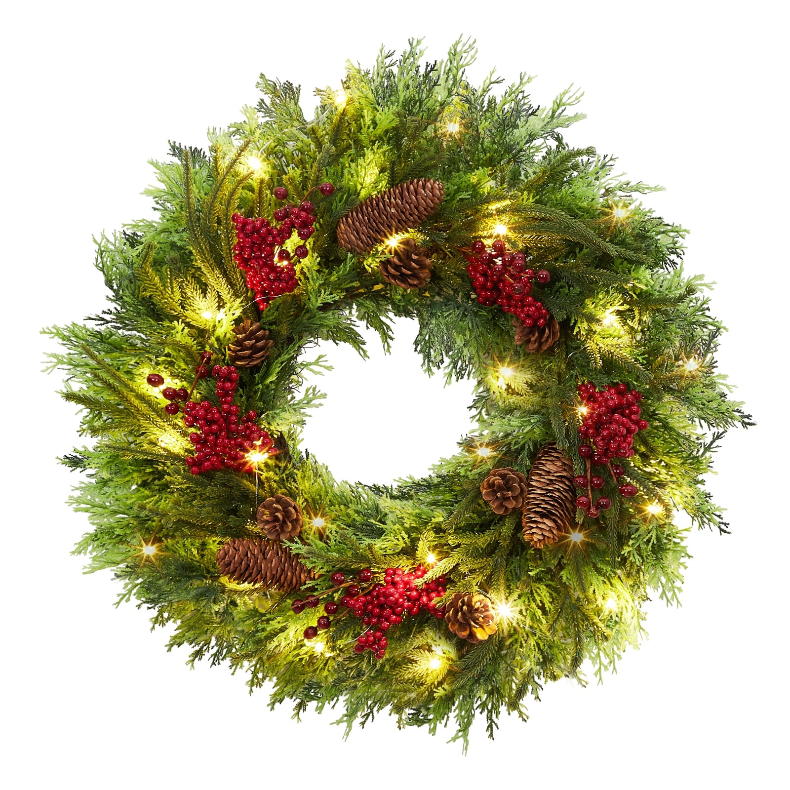 22" Christmas Wreath with Lights, Pre-Lit Xmas Wreaths for Front Door Fireplace Wall Holiday Decor