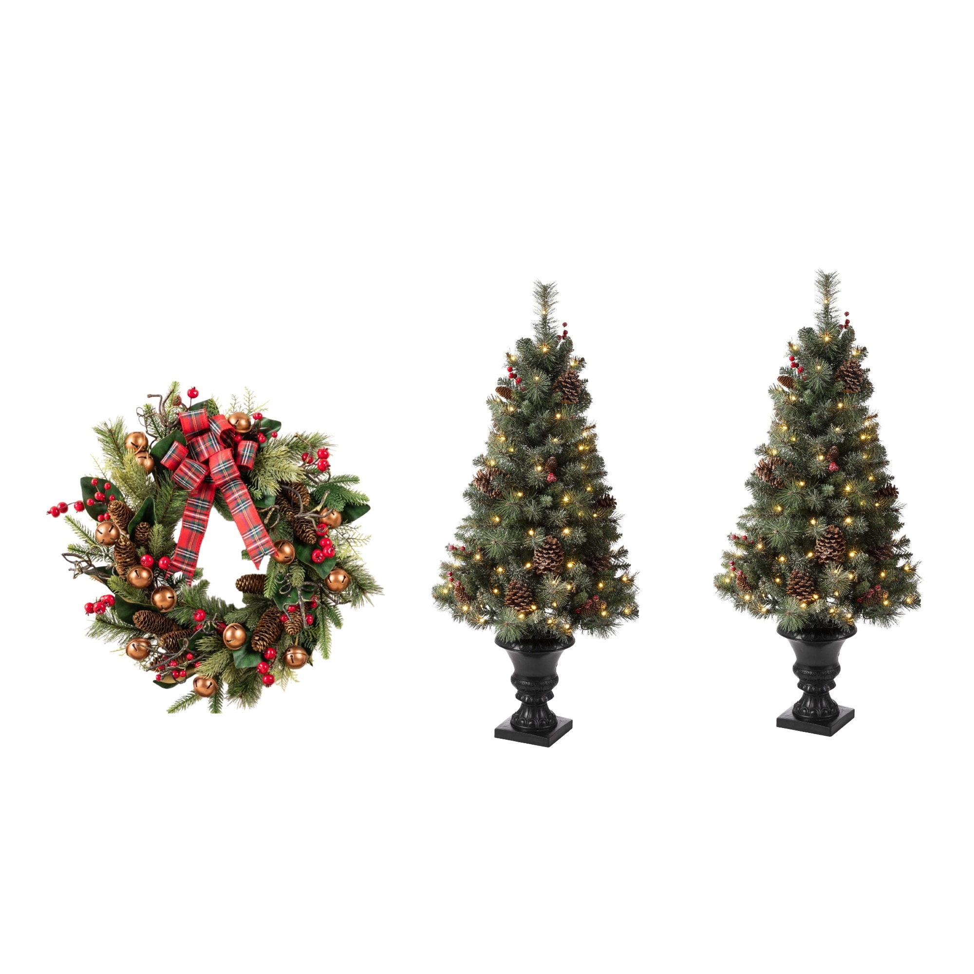 Glitzhome 4/5ft Pre-Lit Snow Flocked Christmas Tree in Pot, Berry Bow Wreath and Garland Set Xmas Decor