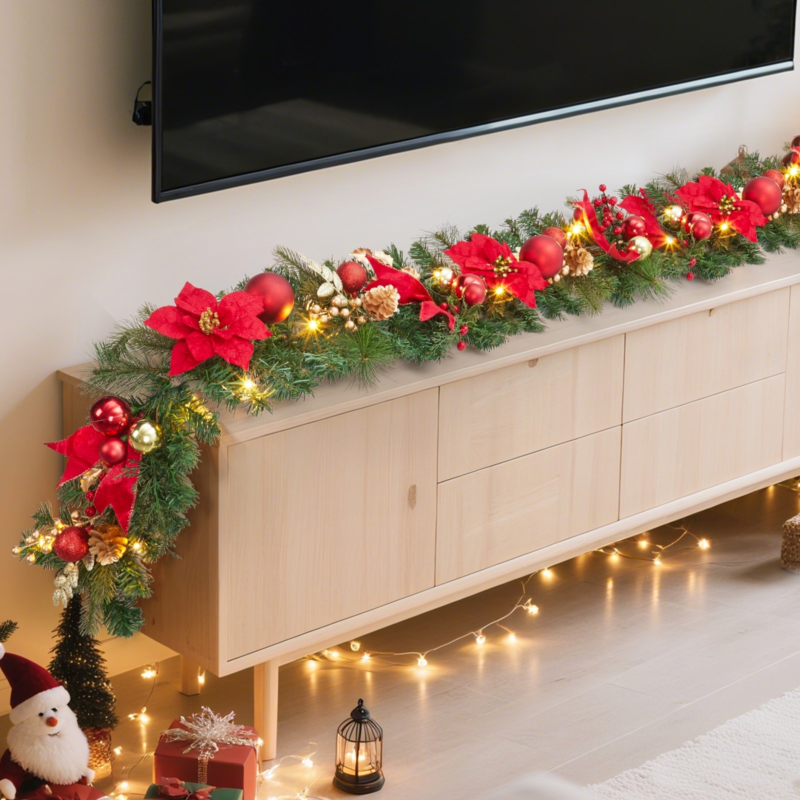 6' Prelit Christmas Garland for Mantle, Battery Operated Xmas Garland with Poinsettias Red Gold Ball Ornaments