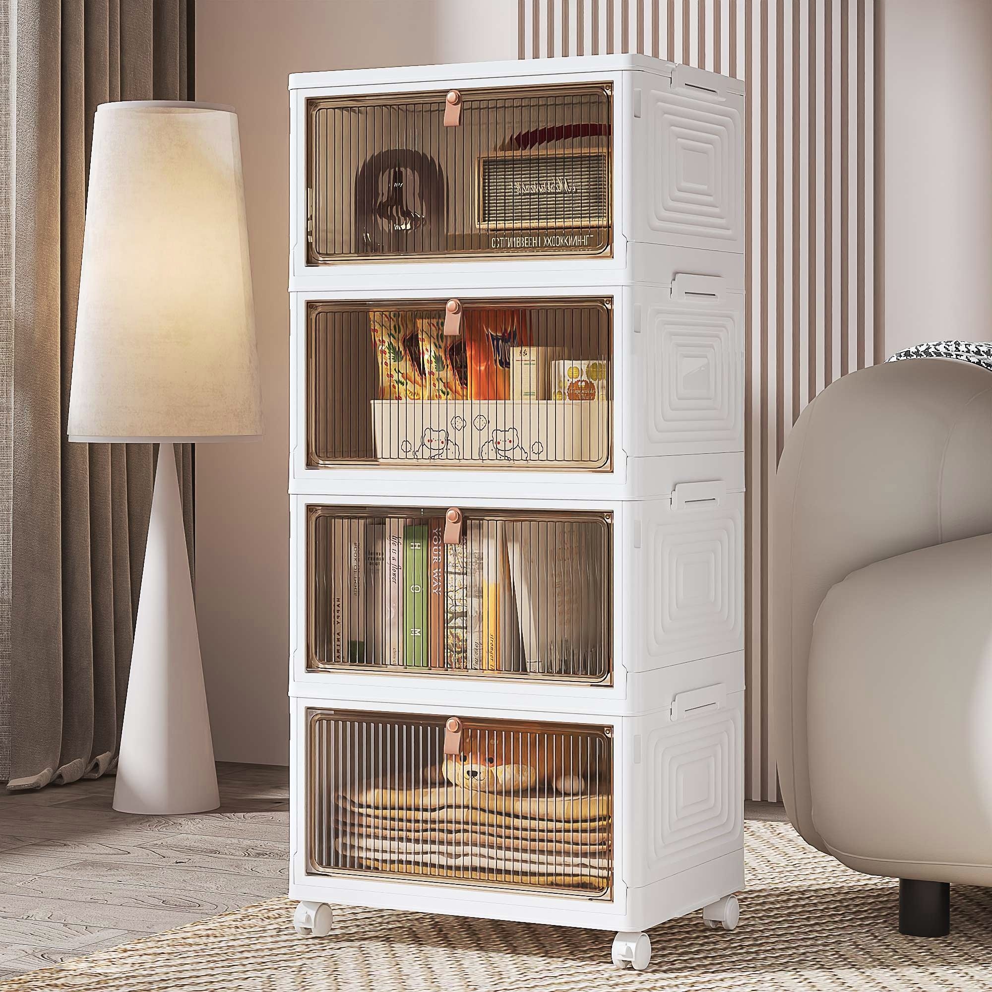 4 Tier Plastic Storage Bins Stackable Storage Containers with Wheels Folding Storage Boxes Closet Organizers - 3-Tier