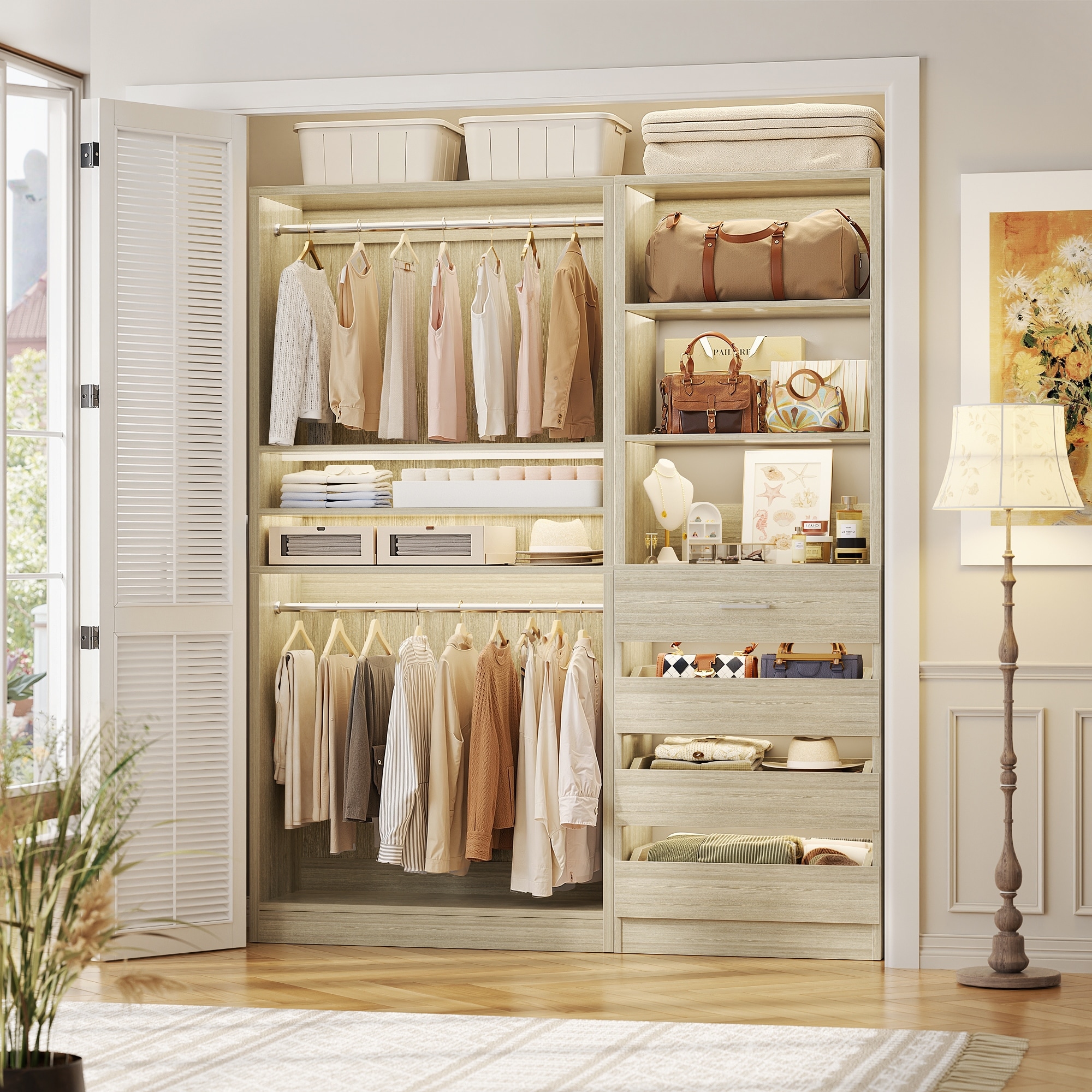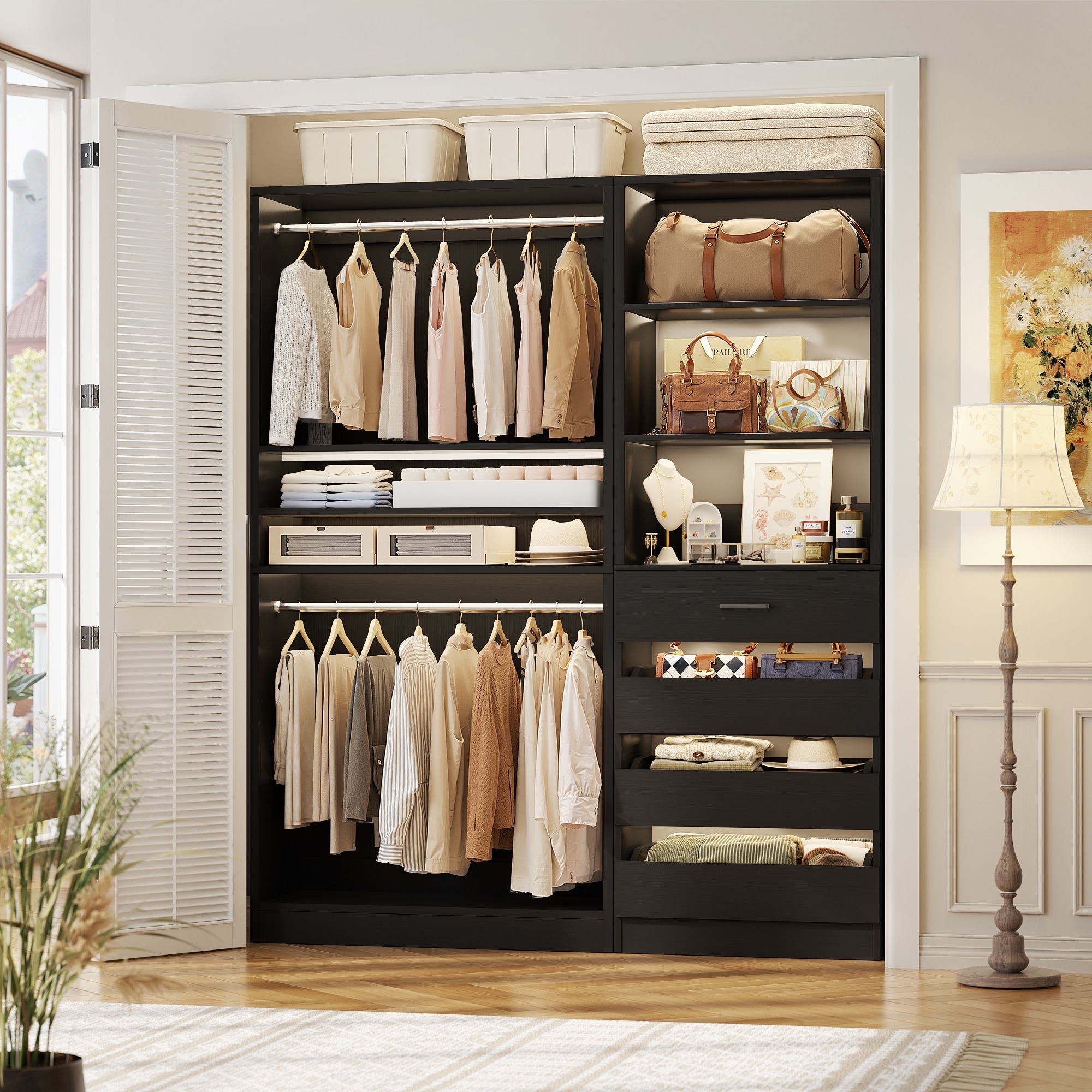Set of 2 Closet Organizer with Wood Drawers and Hanging Rods, Closet System with Adjustable Shelves
