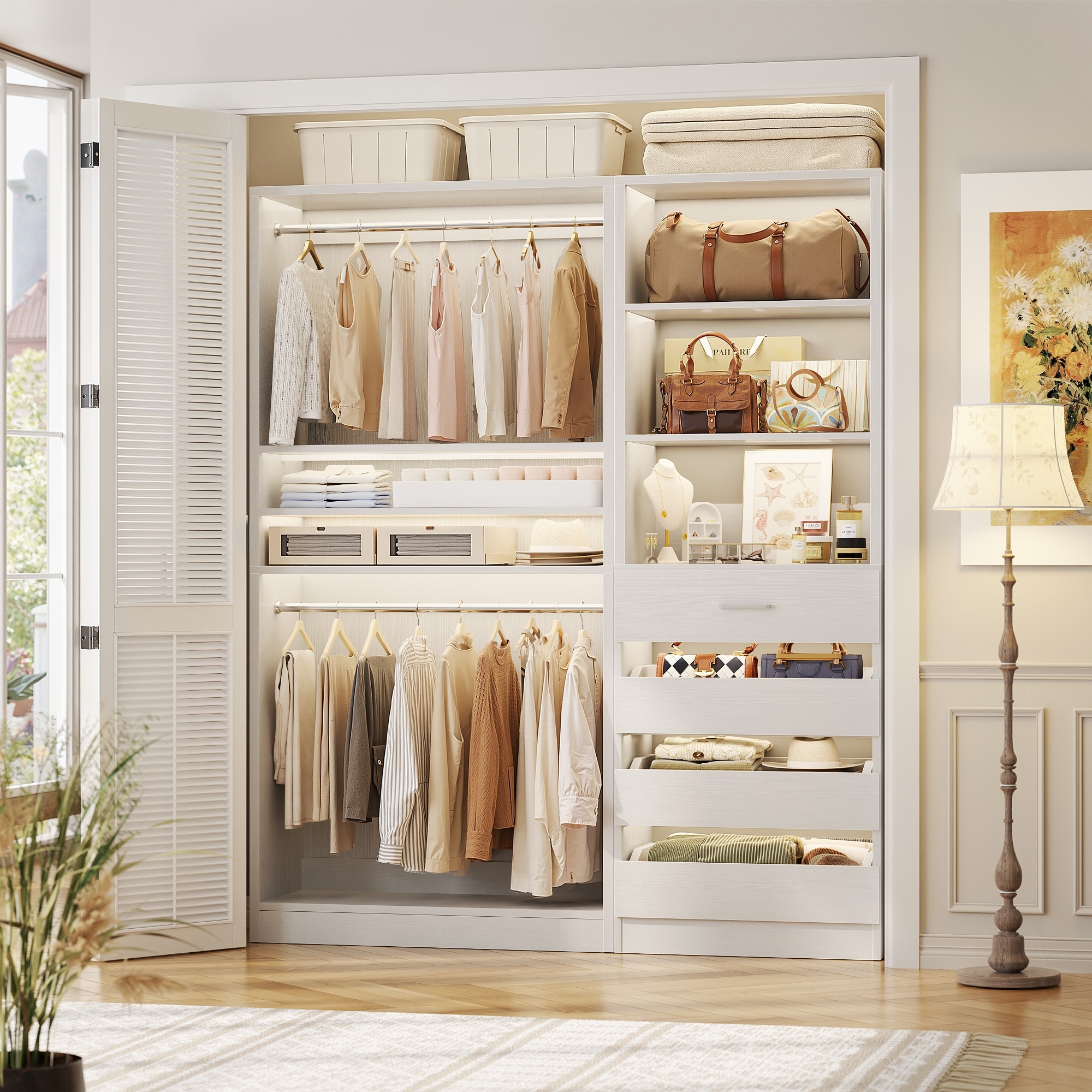 40''-120'' Large Closet System with Tower Shelves and Wood Drawers, Freestanding Closet Organizer with Hanging Rods