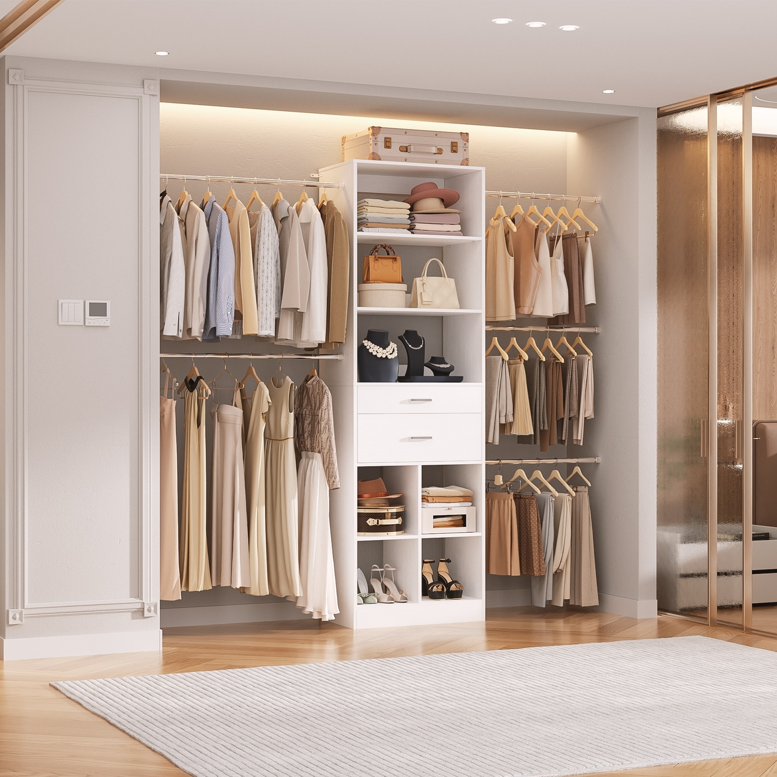 66''-100'' Walk-in Closet Organizer with 5 Hanging Rods and 2 Wooden Drawers,4-8FT Sturdy Closet System with Storage Shelves