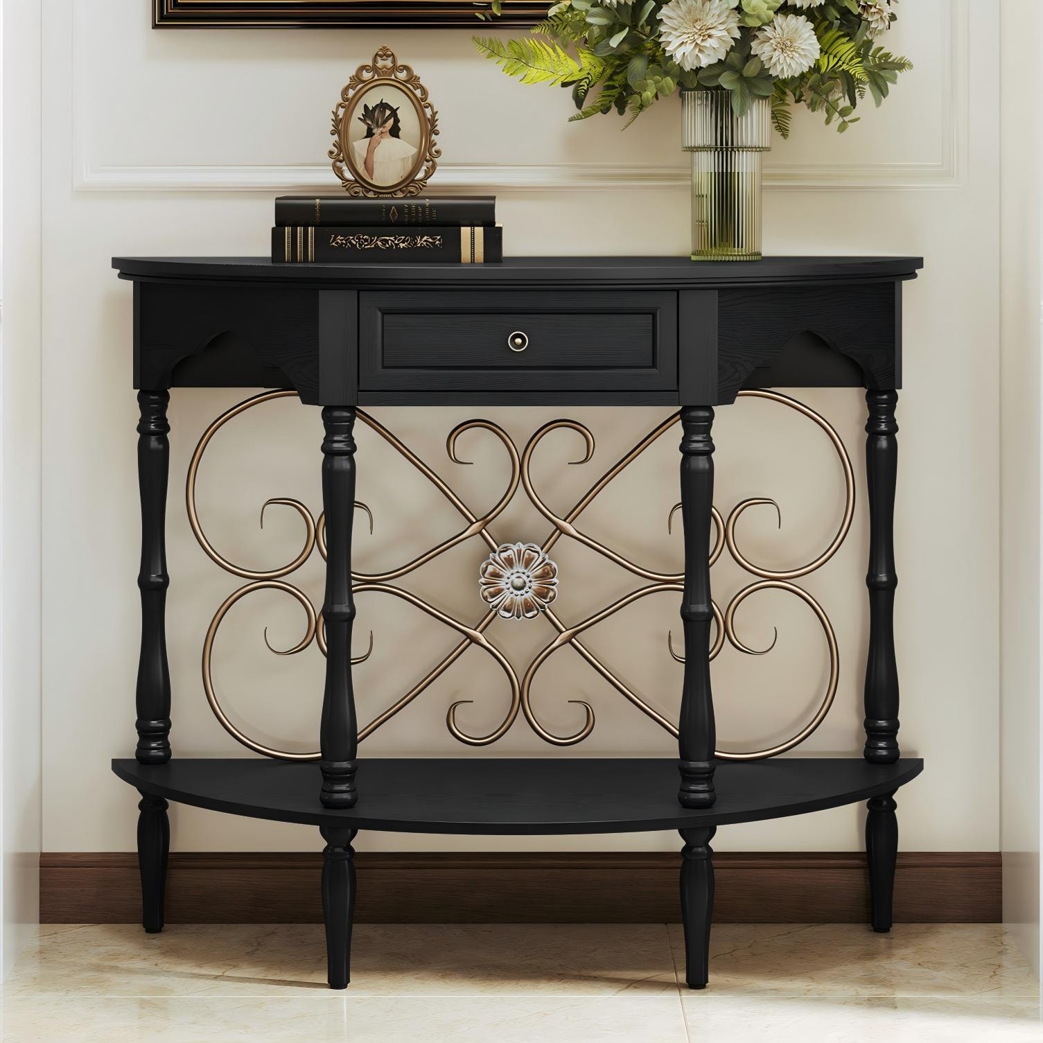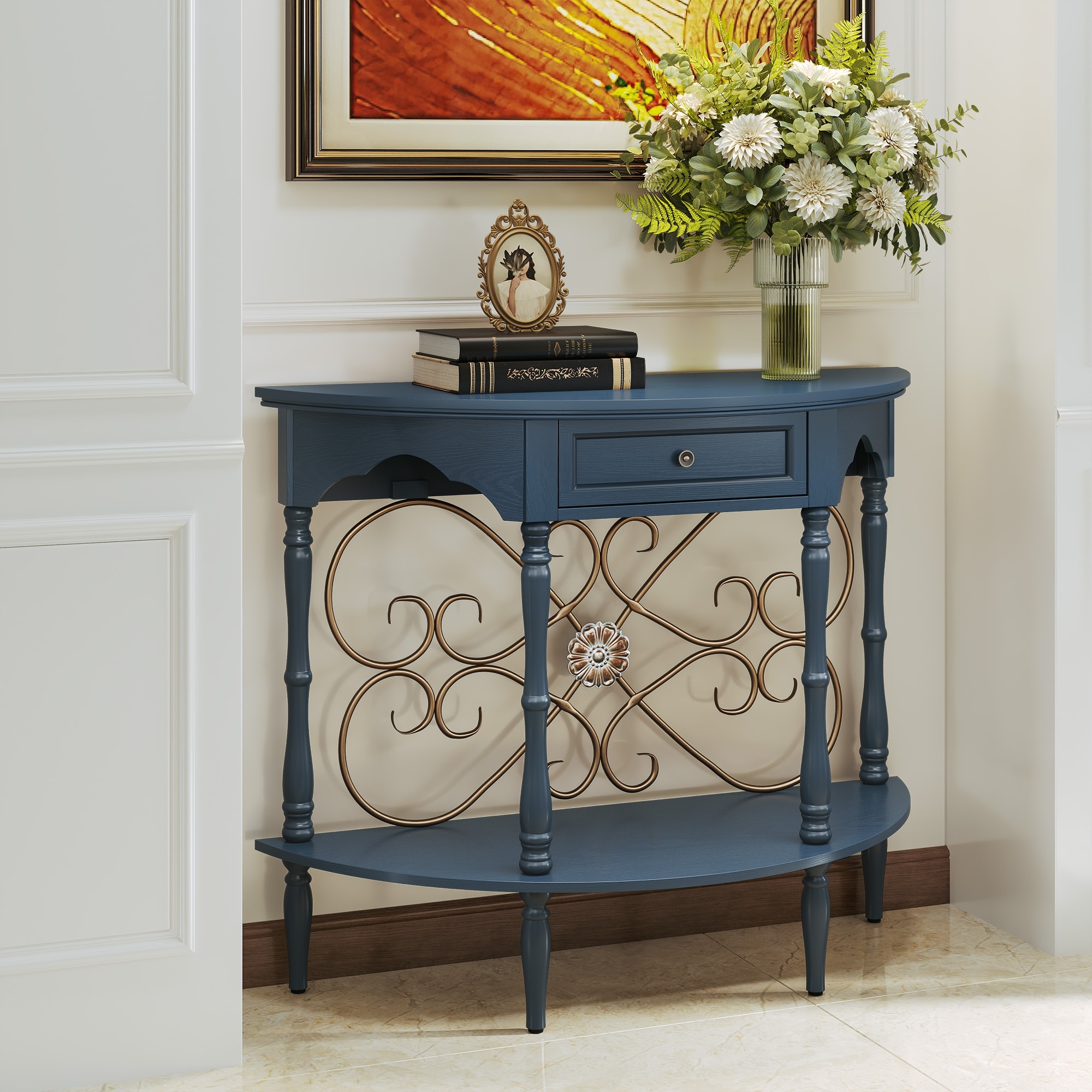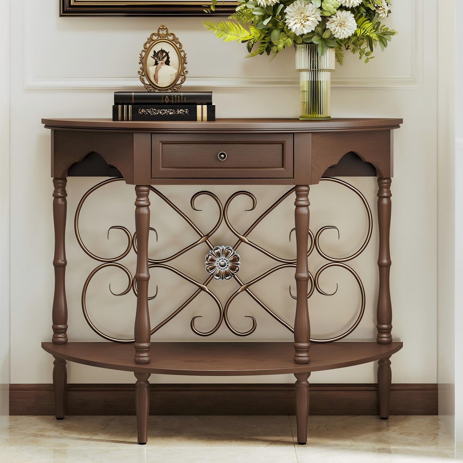 Vintage Curved Console Table, 40" Half-Moon Entryway Table Rustic Wood & Metal Accent Table